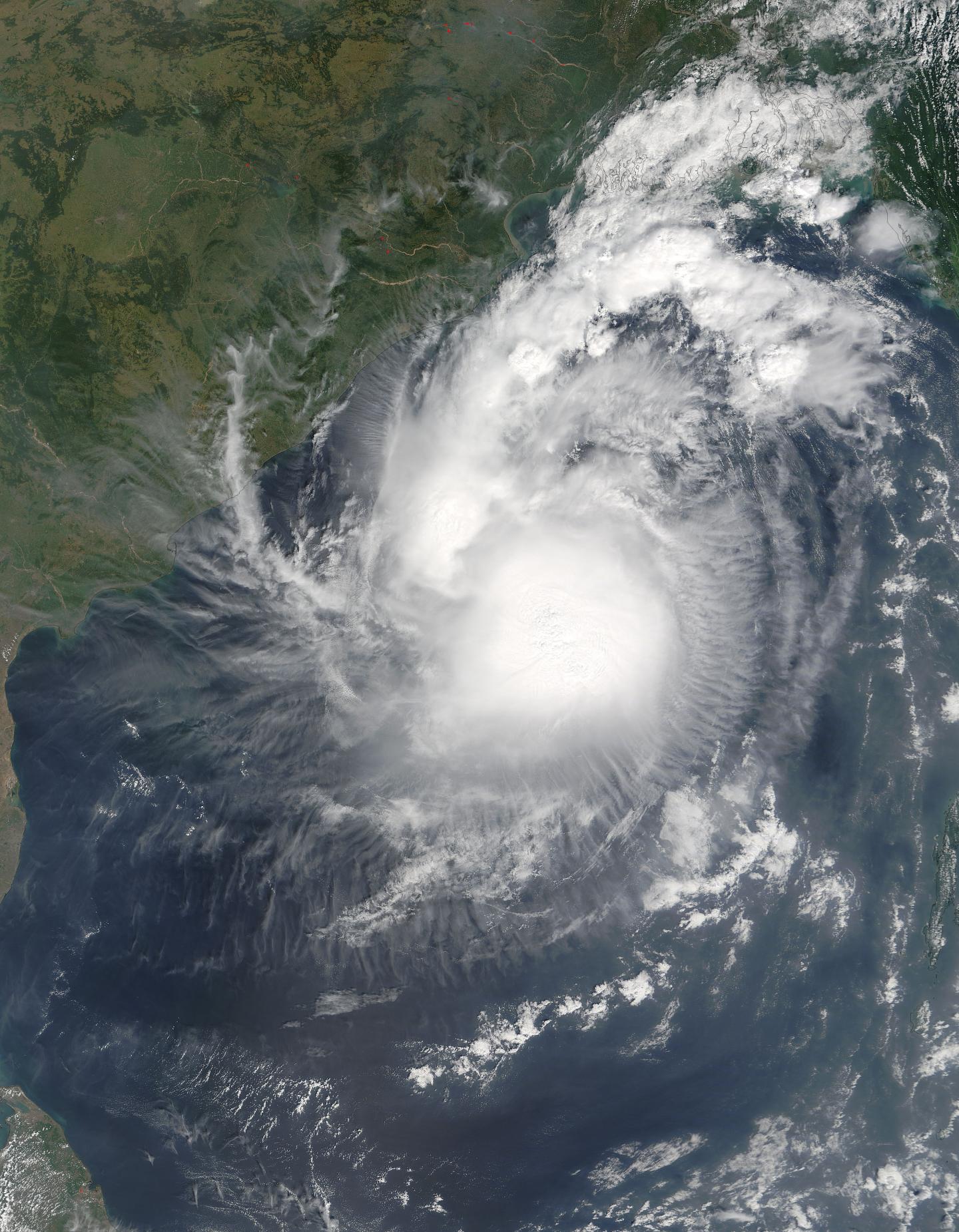 This MODIS image from the Terra satellite, acquired on April 28, 2006, shows Cyclone Mala over the Bay of Bengal. In this image, you can see the coastline of India to the west, Bangladesh to the north, and Myanmar (formerly Burma) to the north-east. The peninsula that looks like it is jutting into the cyclone is part of Myanmar. The edge of Thailand is just visible in the far right part of this image. The cyclone is expected in make landfall in Myanmar sometime on April 29th. Also the cyclone can touch down much quicker on the coastline. And will show more on satellite.
