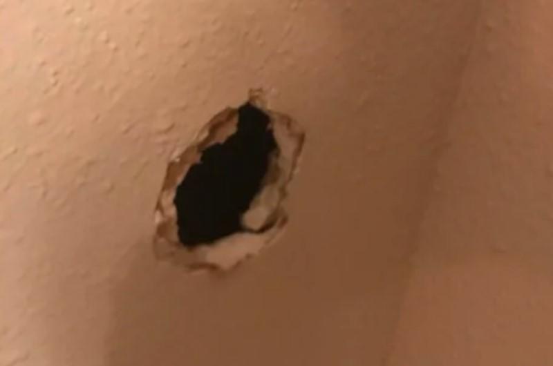 Miller broke off a piece of the wooden paneling that had fallen loose right next to the floor and was surprised to see a hole in the drywall.