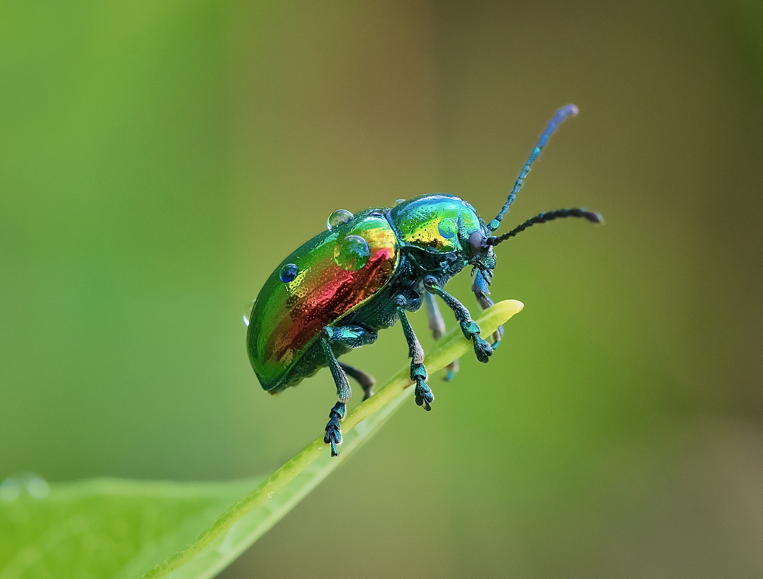 Native to Eastern North America to the Rocky Mountains, the dogbane beetle can appear to have an iridescent shell of blue, green, and orange hues depending on the light.