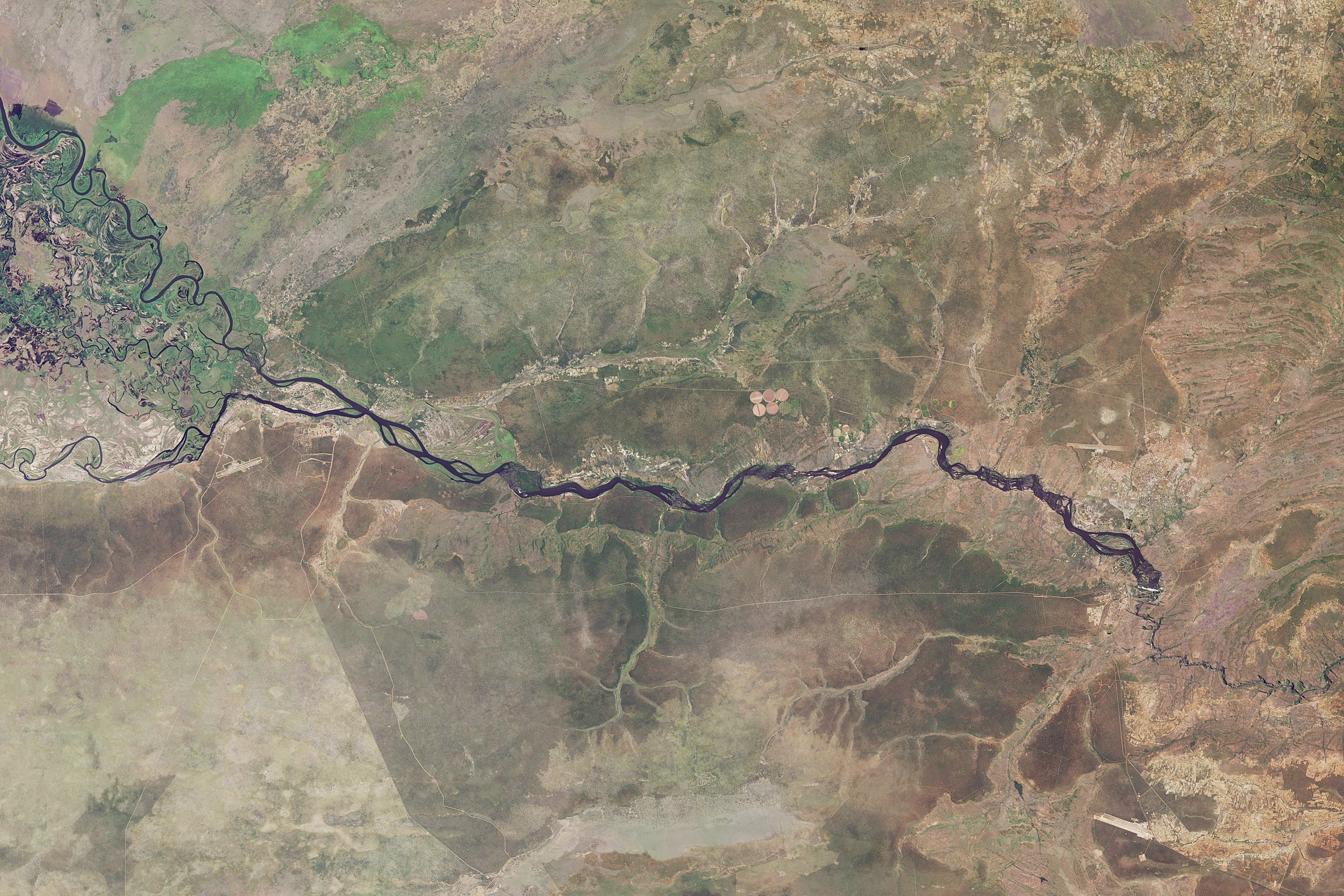 Perhaps the world’s most notable tripoints fall in the middle of the Zambezi River, near the borders of Botswana, Namibia, Zambia, and Zimbabwe in southern Africa. The area features a unique “double tripoint,” with the two tripoints separated by about 150 meters (490 feet). The two tripoints are shown on this satellite image of the Zambezi River, which was captured by the Operational Land Imager (OLI) on Landsat 8. Namibia, Botswana, and Zambia come together at a westerly point in the river; Zambia, Zimbabwe, and Botswana come together at the easterly point. The borders shown above come from a data set maintained by the U.S. State Department’s Humanitarian Information Unit.