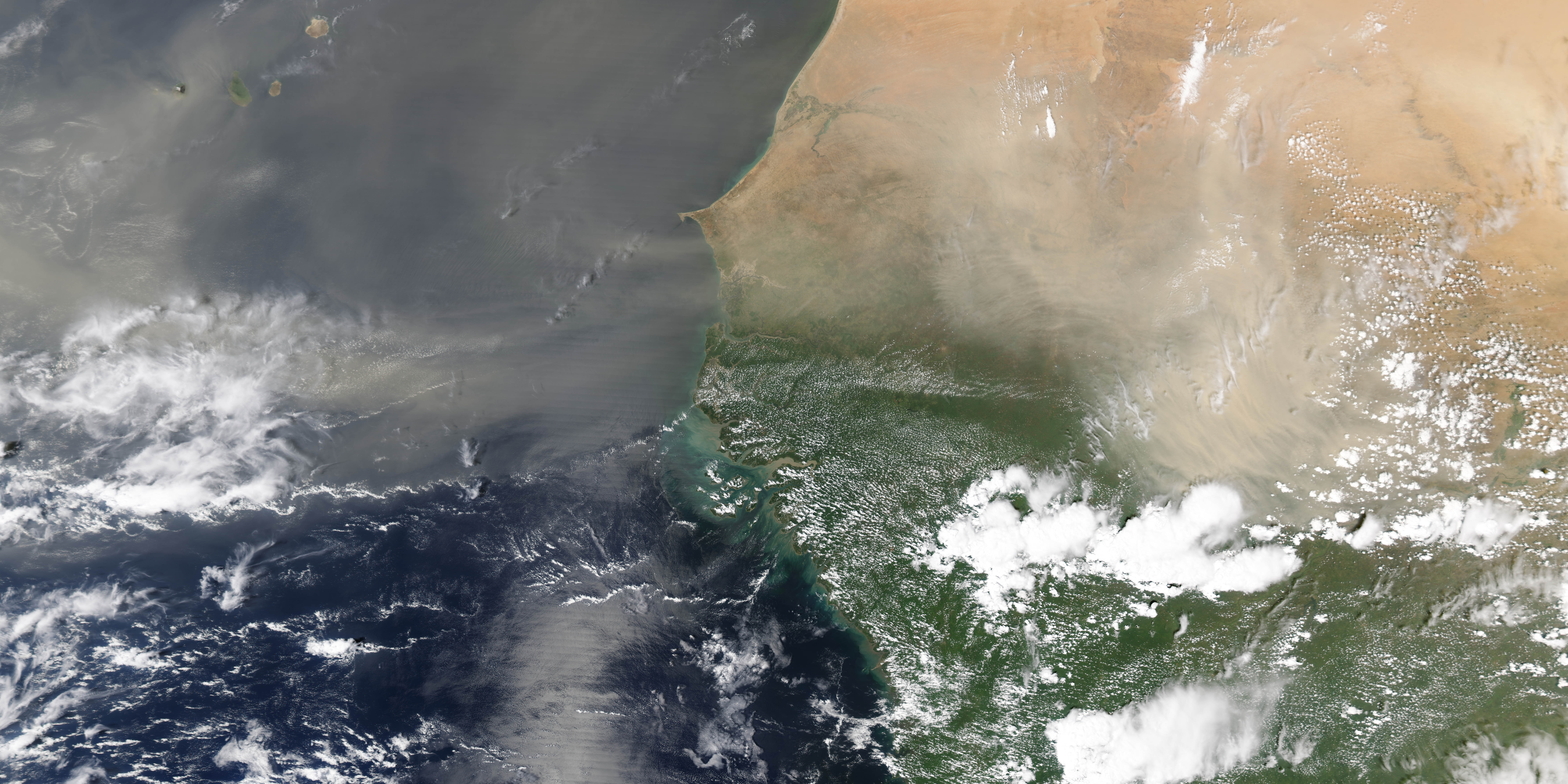 This true-color image shows a large cloud of Saharan Desert dust (tan pixels) blowing westward over Niger, Mali, and Mauritania in northwestern Africa. The dust can also be seen extending westward over the Atlantic ocean in this scene. The bright feature in the eastern Atlantic (image bottom center) is sunglint, caused when the Sun’s rays are reflected off the surface of the ocean directly back at the satellite.