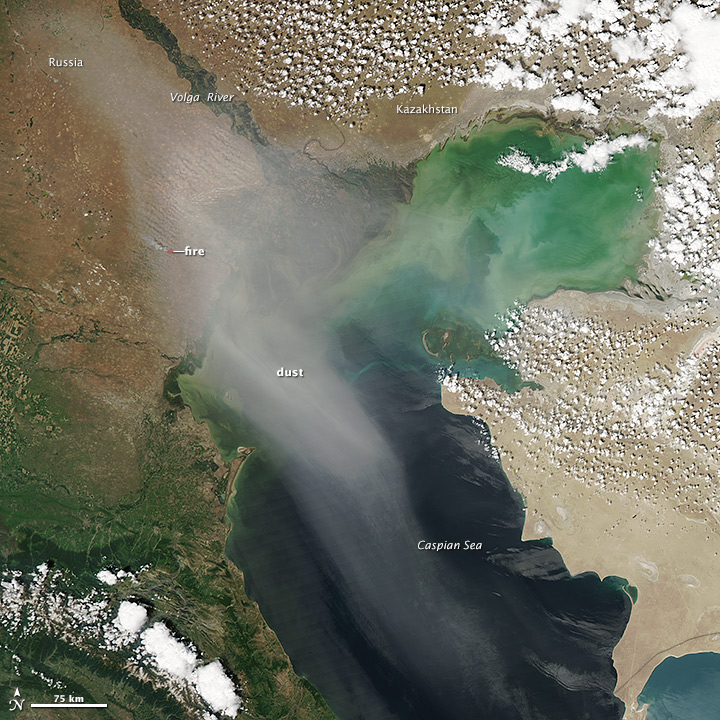 Dune fields west of the Volga River appear to be the source of some of the dust. A longer plume, most likely made of dust from Turkmenistan, is also visible crossing the Caspian Sea.