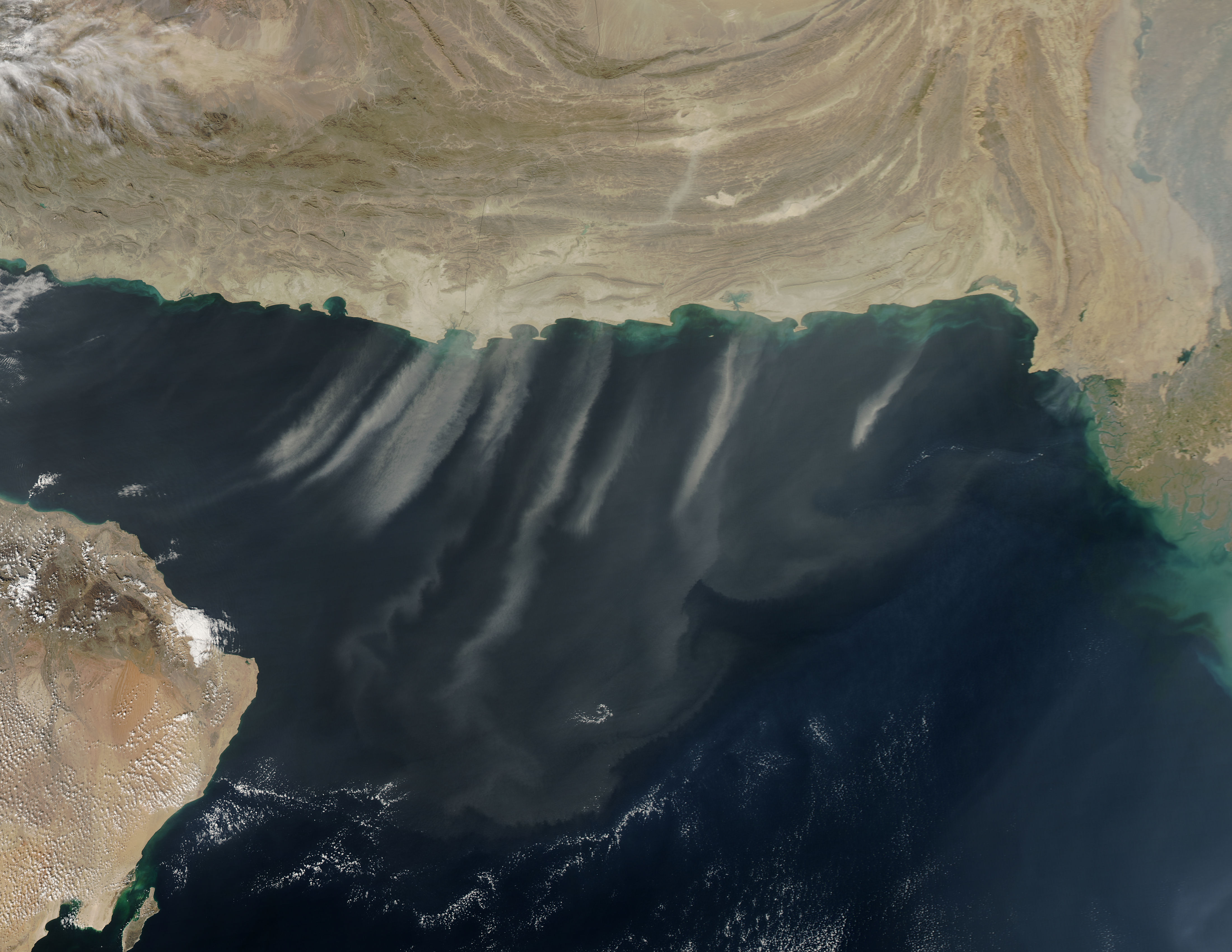 Today’s Image of the Day shows dust from Iran and Pakistan streaming over the Arabian Sea in late November 2016. The Moderate Resolution Imaging Spectroradiometer (MODIS) aboard NASA’s Aqua satellite captured this true-color image of the event on November 22.