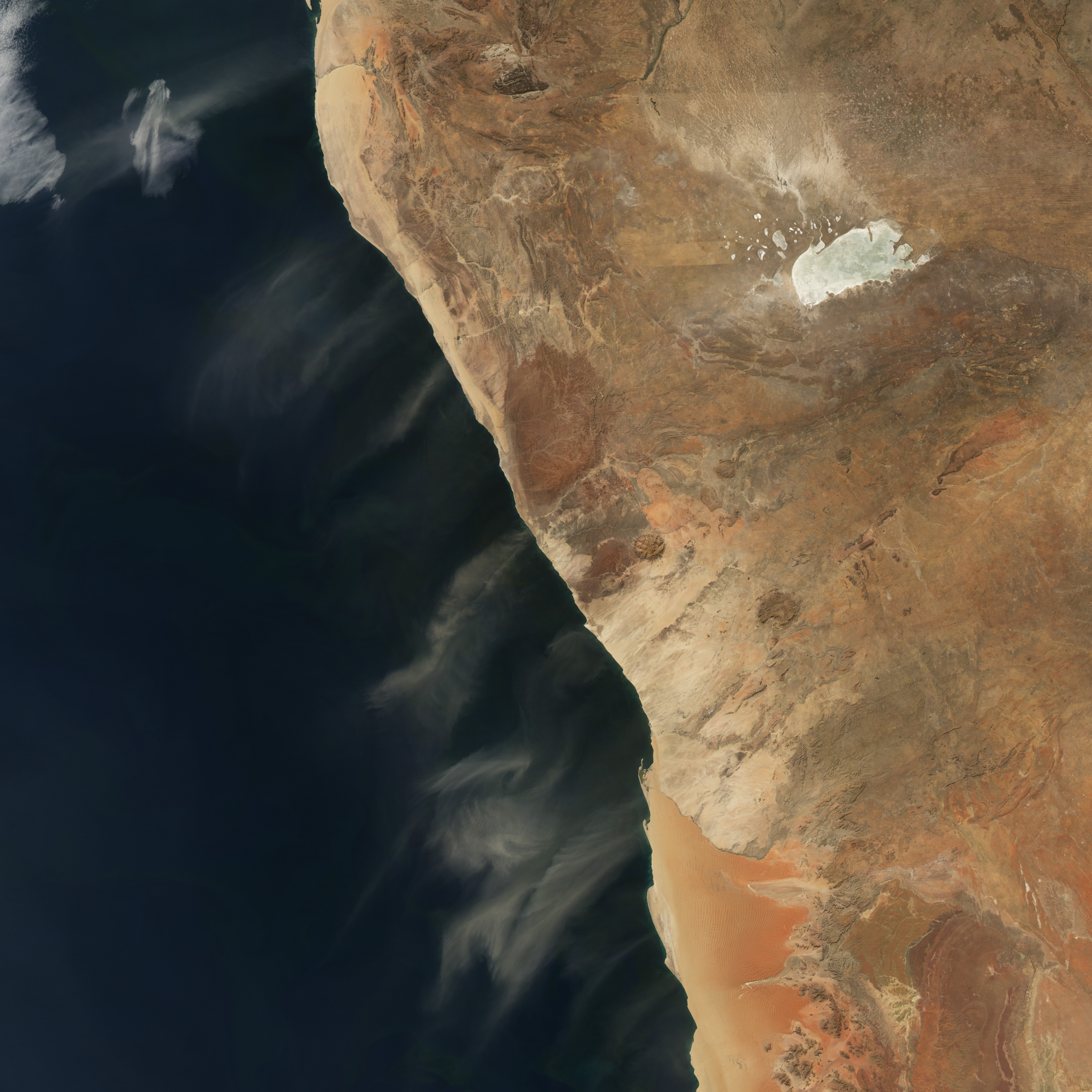 Transparent veils of dust off Namibia’s coast into the southern Atlantic Ocean in this true-color Moderate Resolution Imaging Spectroradiometer (MODIS) image acquired by the Aqua satellite on July 7, 2004. The dust follows the wind arcing toward the south, while above and below white clouds cast black shadows on land and sea. Underneath the clouds, bright orange sand marks the Namib Desert, which is home to some of the tallest sand dunes on the planet—some reaching from 150-300 meters in height, and visible from space in the high-resolution 250-meter image.