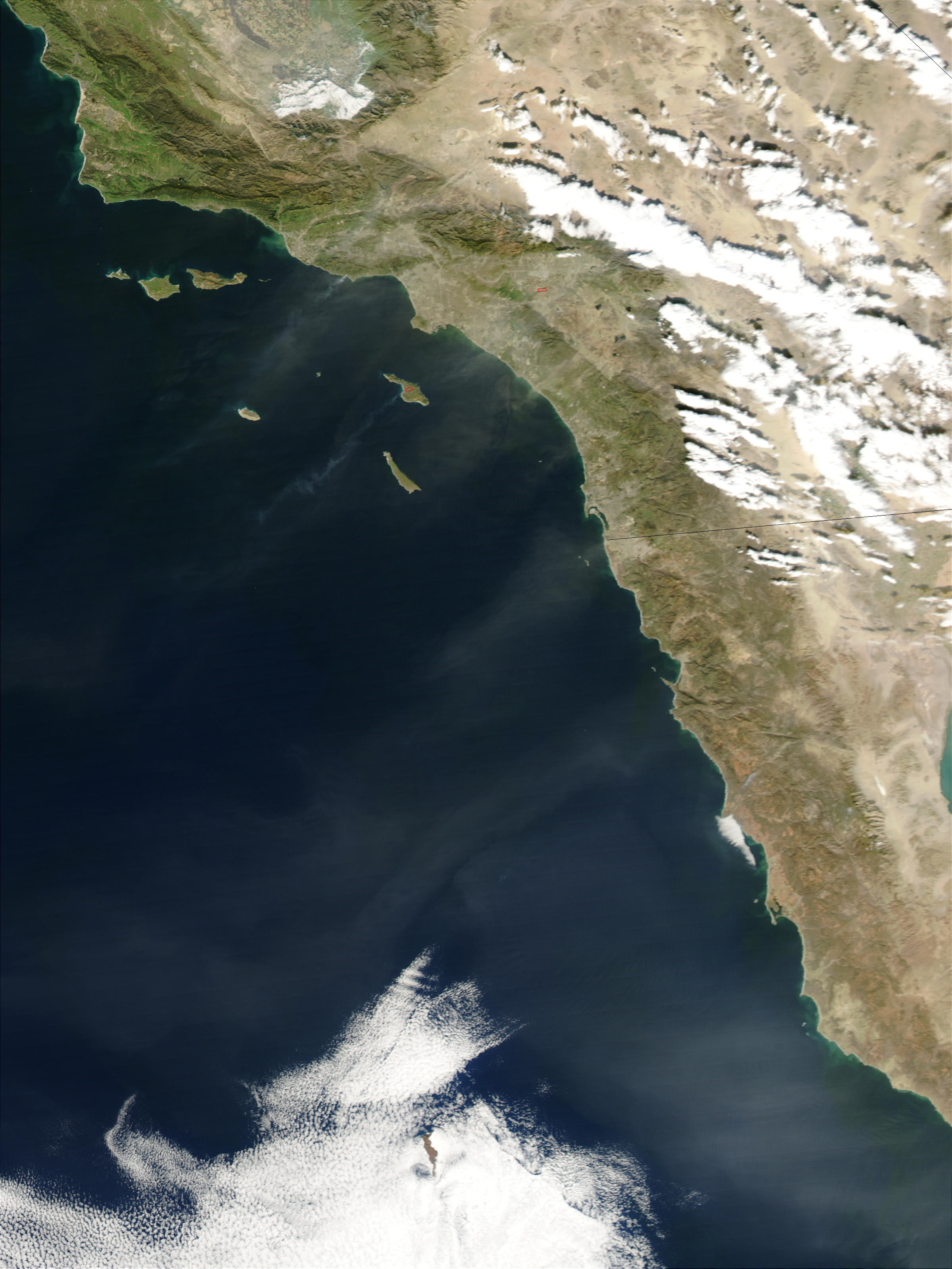 On January 6, 2002, Santa Ana winds blew dust from interior deserts and other dry areas out over California and the Pacific Ocean. This true-color Moderate Resolution Imaging Spectroradiometer (MODIS). Also the image from the Aqua satellite shows streamers of dust blowing southwestward over the Los Angeles metropolitan area.