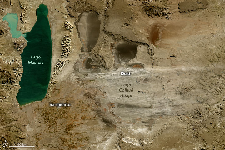 According to NASA, northwesterly winds routinely blow down the eastern side of the Andes Mountains and stir up dust from Argentina’s Lake Colhué Huapi, making it the largest and most active source of dust storms in the region.