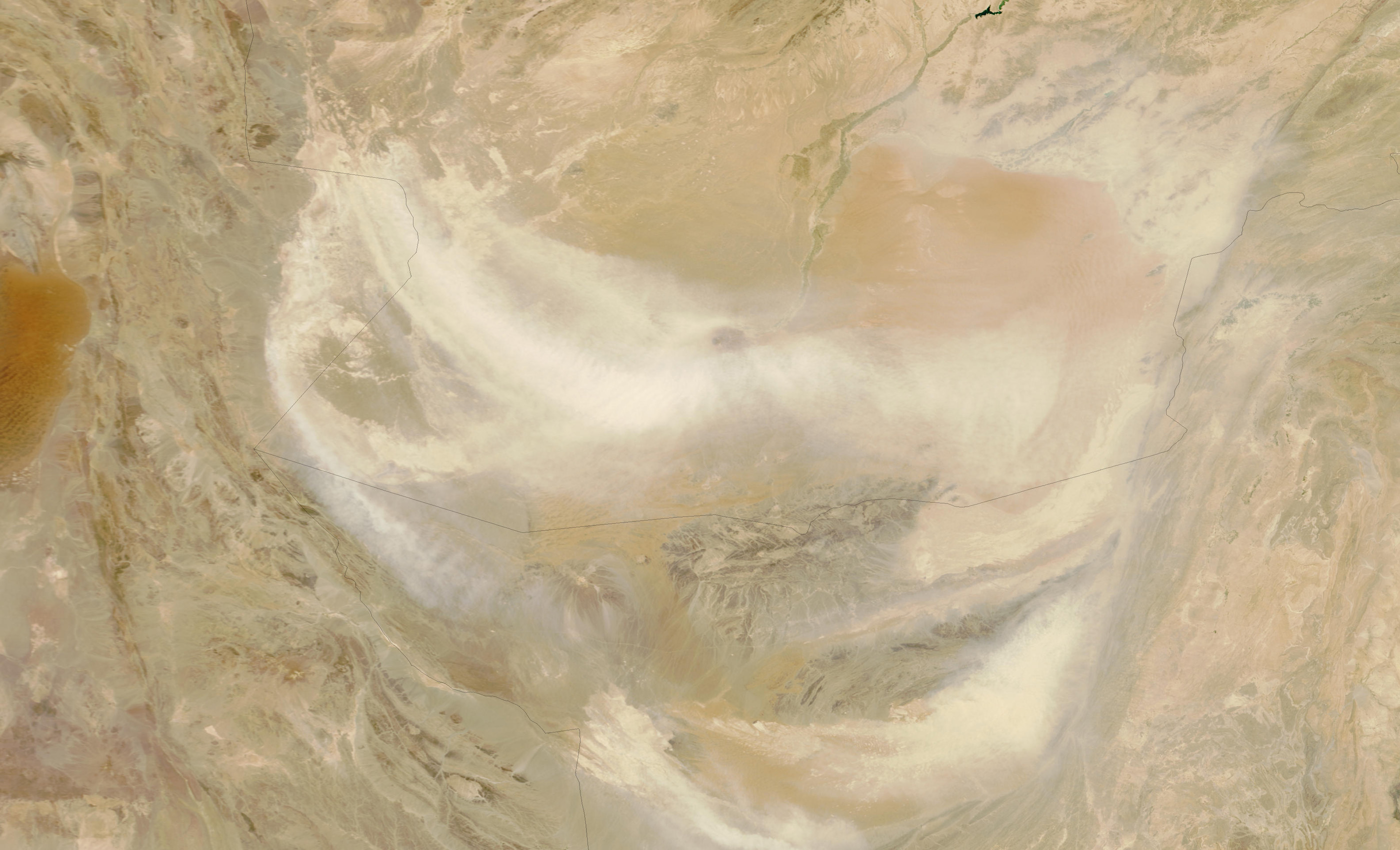 A large dust storm was sweeping across the rugged, arid terrain of southern Afghanistan (top), Pakistan (bottom), and extreme eastern Iran (left edge) on June 6 and June 7, 2004, when the Moderate Resolution Imaging Spectroradiometer (MODIS) on NASA.s Aqua and Terra satellites observed the region. The pale dust dominates the center of the image, while the large sandy deserts of the region appear rust-colored.