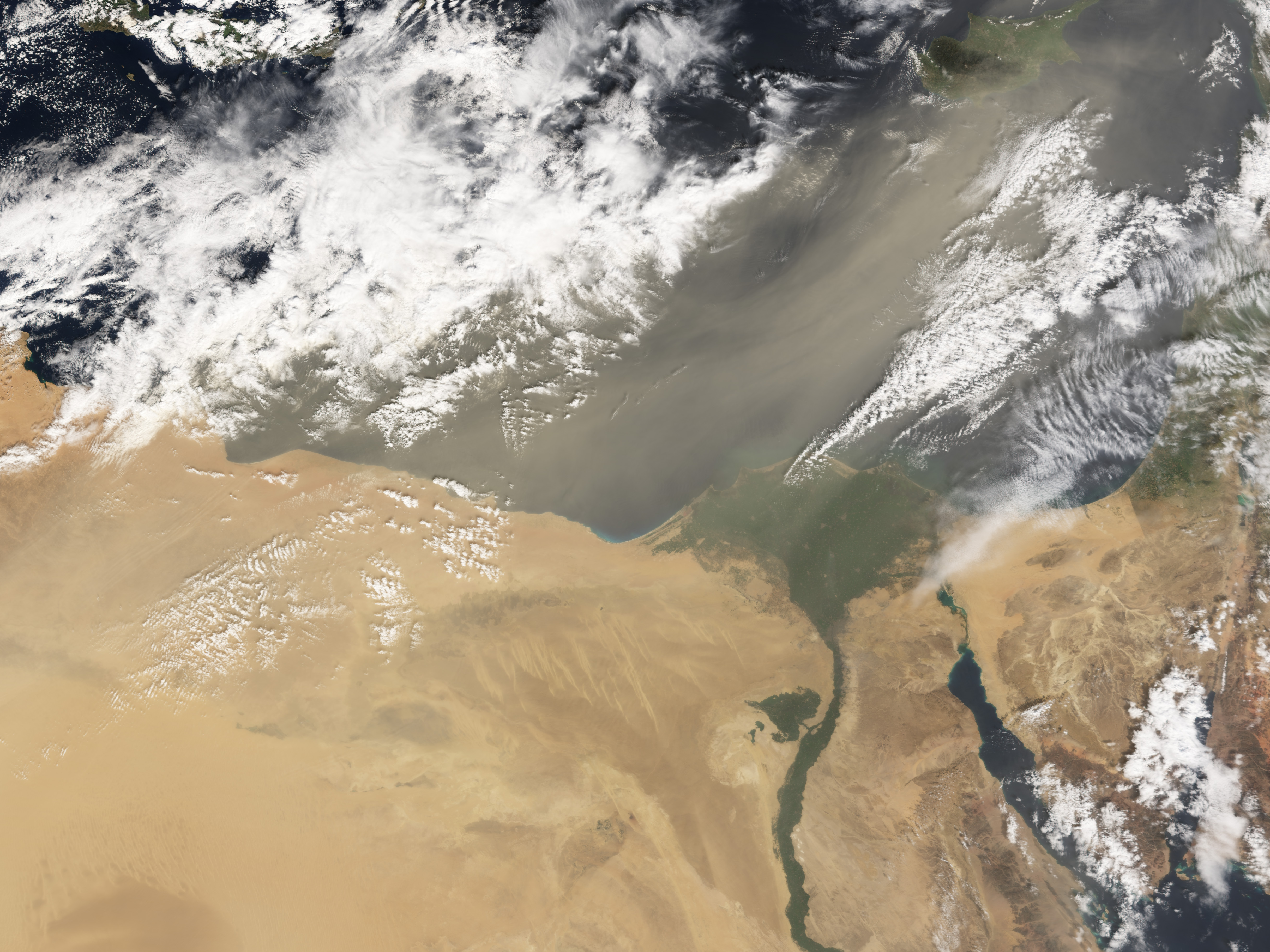 Dust Storm in Egypt and Libya. Also A thick and massive cloud of Saharan Desert dust filled the skies over most of Egypt and eastern Libya on January 22, 2004. Roughly the size of the U.S. state of Texas, the tan-colored blanket of dust almost completely obscures the view of the surface in this true-color image of the area, acquired by the Moderate Resolution Imaging Spectroradiometer (MODIS) aboard NASA’s Aqua satellite. Blowing northeastward over the southeastern Mediterranean, toward Israel and Lebanon, the dust is so thick in some places it gives the appearance of a solid land mass extending out into the water when seen from above. The bright white patches in this scene are clouds, which are higher in elevation than the dust.