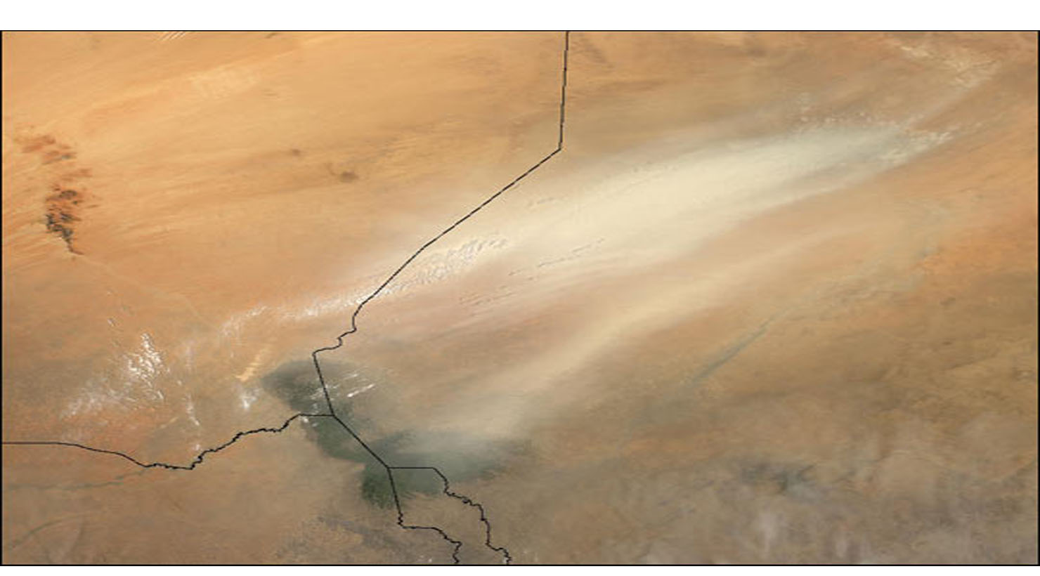 Highly reflective dust was blowing from the northeast over Lake Chad (green splash at bottom of image) on April 9, 2003. Frequent dust storms are just one of the many factors slowly eating away at this prime source of freshwater for people, animals and plants in (counterclockwise from top left) Niger, Nigeria, Cameroon, and Chad. Increasing demand for irrigation is draining the lake, and blowing sand and desert dust are creating sand dunes that are encroaching on the vegetation along the perimeter of the lake (see high-resolution image).