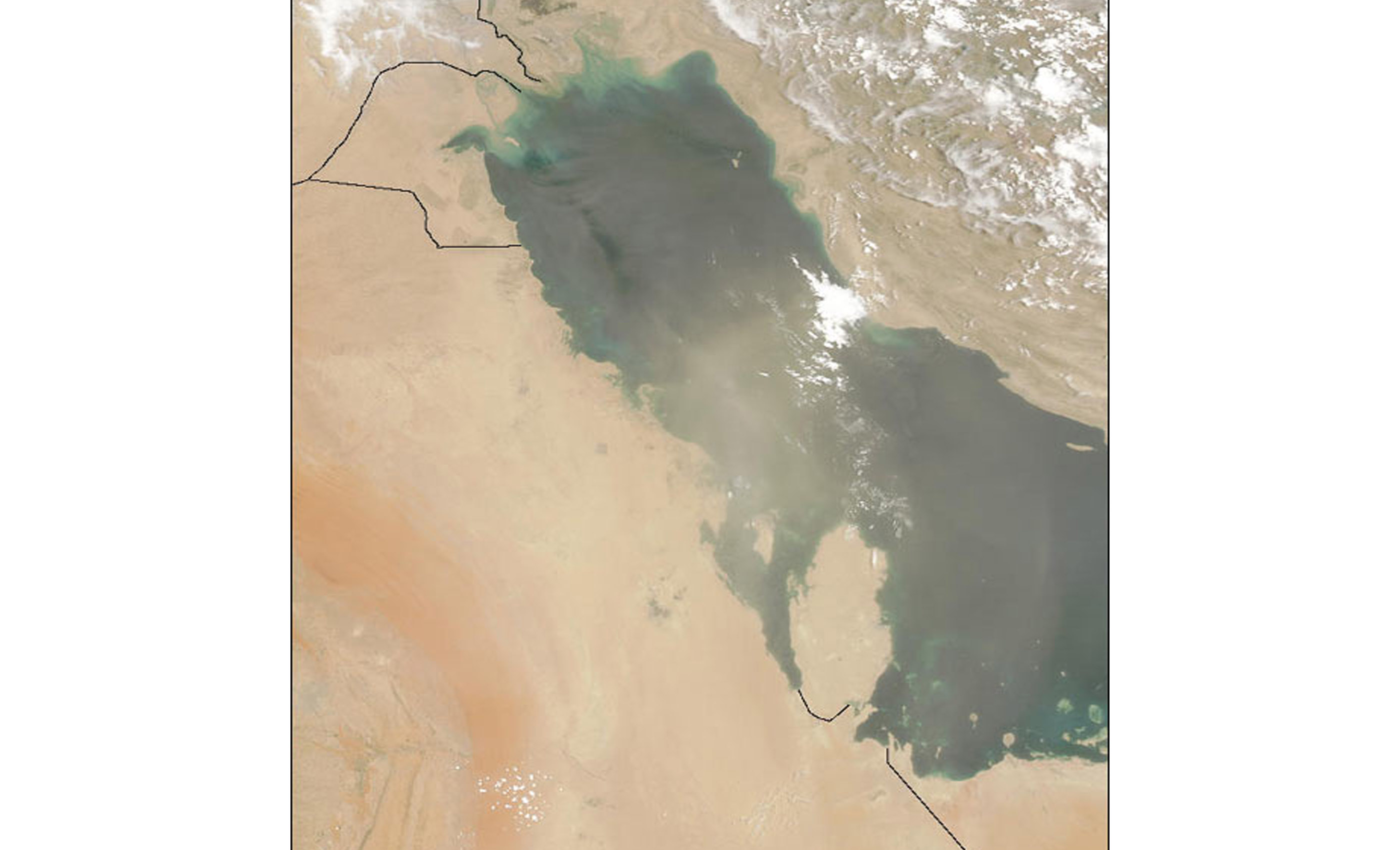 A dust storm was blowing over a wide area of the Middle East on May 28, 2003. This Moderate Resolution Imaging Spectroradiometer (MODIS) image shows a haze of dust over (clockwise from top right) Iran, United Arab Emirates, Saudi Arabia, Kuwait, and Iraq. The dust is especially thick in the center of the Persian Gulf.