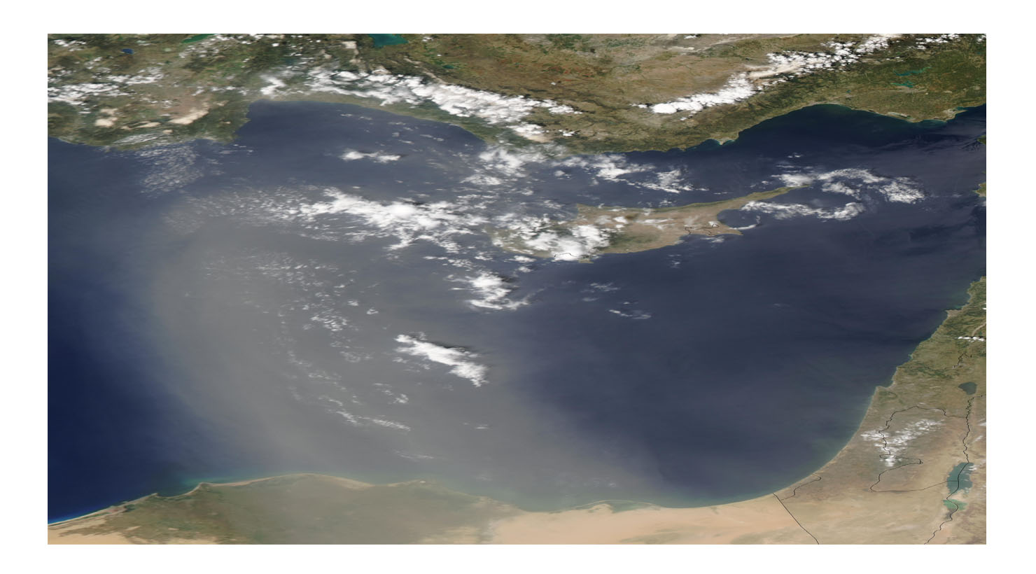 Dust Storm Over the Eastern Mediterranean Sea. A large plume of Saharan Desert dust (tan pixels) was blowing over Egypt and the Eastern Mediterranean on May 10, 2003. This true-color image was acquired by the Moderate Resolution Imaging Spectroradiometer (MODIS), flying aboard NASA´s Aqua satellite.
