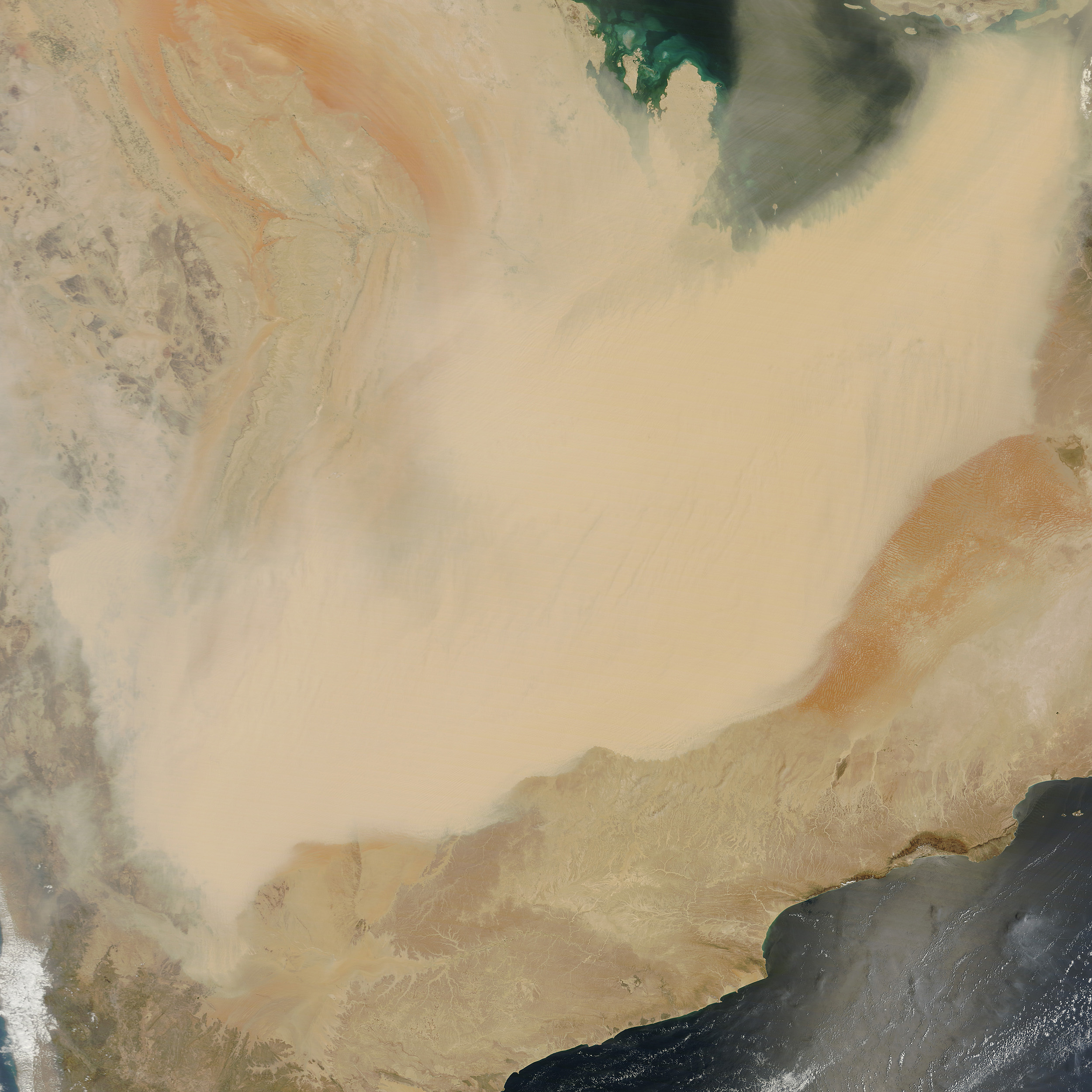 The Moderate Resolution Imaging Spectroradiometers (MODIS) on NASA’s Terra and Aqua satellites captured a view of a massive wall of dust pushing southeast across the Arabian Peninsula on April 2, 2015.