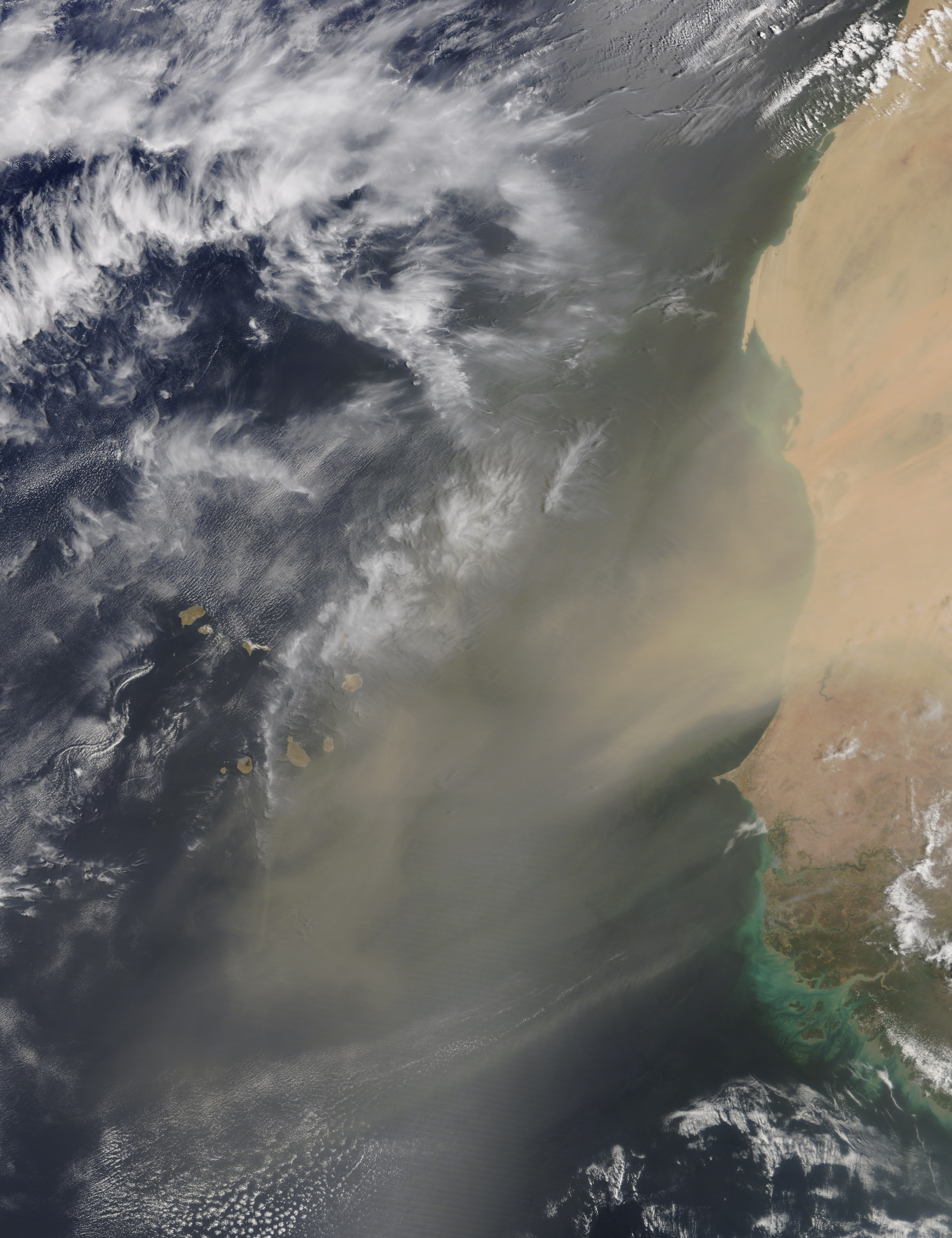 A massive dust storm off western Africa coast is shown here in this Image of the Day from the NASA Earth Observatory. Strong winds kicked up a substantial amount of dust over the western African desert and carried it out to the Atlantic Ocean all the way to the Cabo Verde islands.