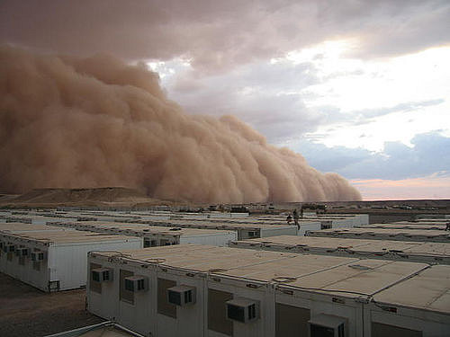 On August 8, 2005, Dust Storms Over Iraq a cloud of dust struck the city of Baghdad, Iraq. Over 1,000 cases of suffocation and other respiratory ailments were reported at local hospitals. The storm looked a like a thick, orange-brown fog that forced traffic to a standstill and residents to seek shelter; visibility was reduced to about 15 meters (49.2 feet). Dust is lifted into the air by wind currents. If the particles are small enough and the upward current is strong enough, dust can rise thousands of meters (1 meter = 3.28 feet) into the air and travel thousands of kilometers (1 kilometer = 0.62 miles). A summer dust storm in this region is called a Shamal, which comes from the Arabic word for north; typically, dust storms are carried by northerly winds.