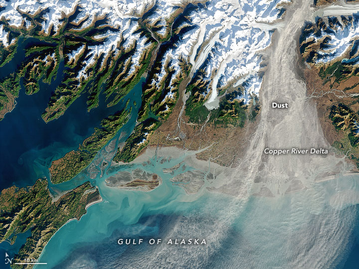 According to NASA, the dust originated upstream in the Copper River Valley, where glaciers crush rocks into a very fine silt that is referred to as “glacial flour.”