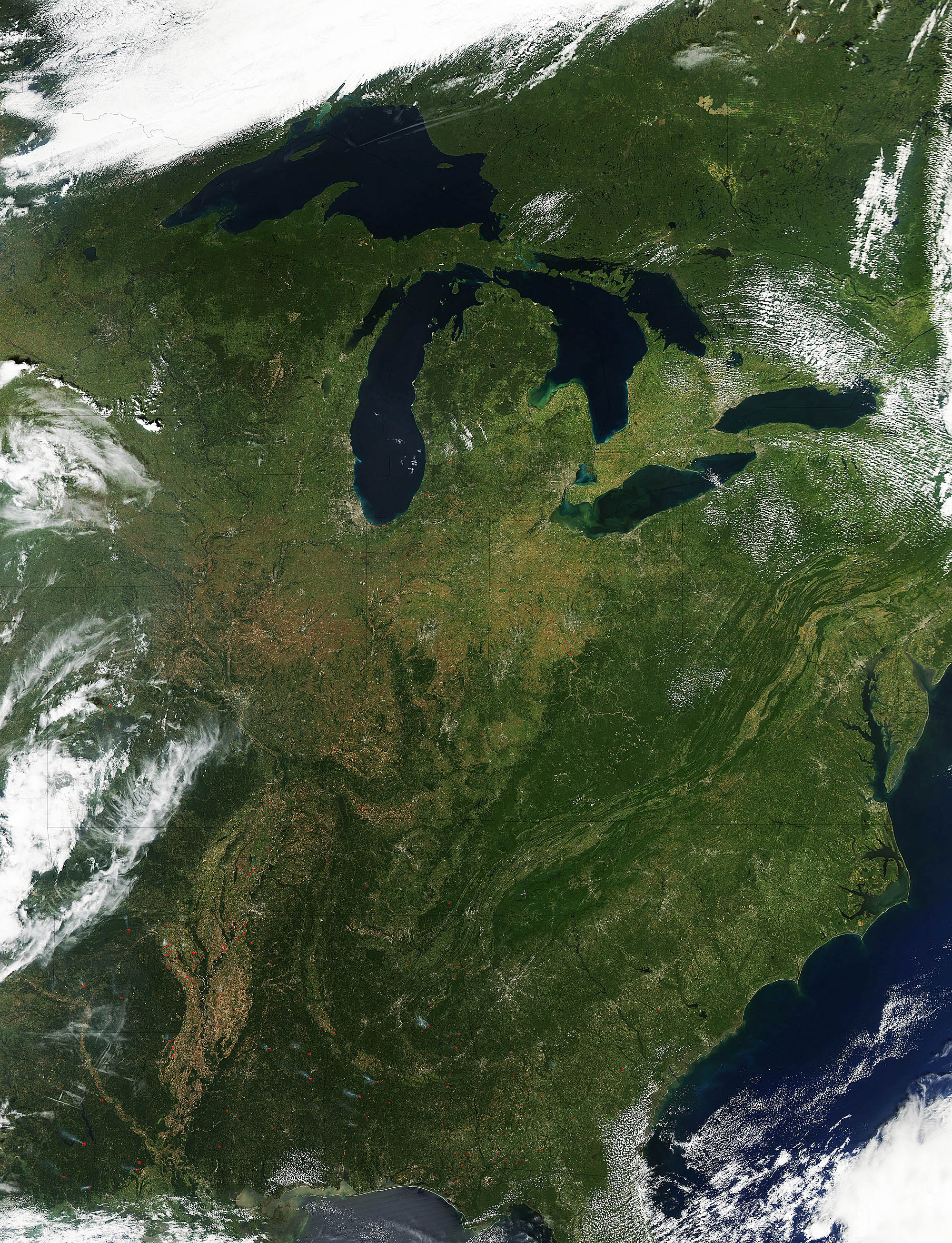 North of the Great Lakes the boreal forests of Canada appear dark green, especially in areas where dark-needled evergreen trees are abundant. South of the border the greens fade into tan as the thinning forests and scrubland gives way to prairie and agricultural cropland. As fall approaches the crops – especially wheat, corn, and soybeans – turn tan as they become ready to harvest. The agricultural areas are most prominent in Illinois, Indiana, and Ohio.