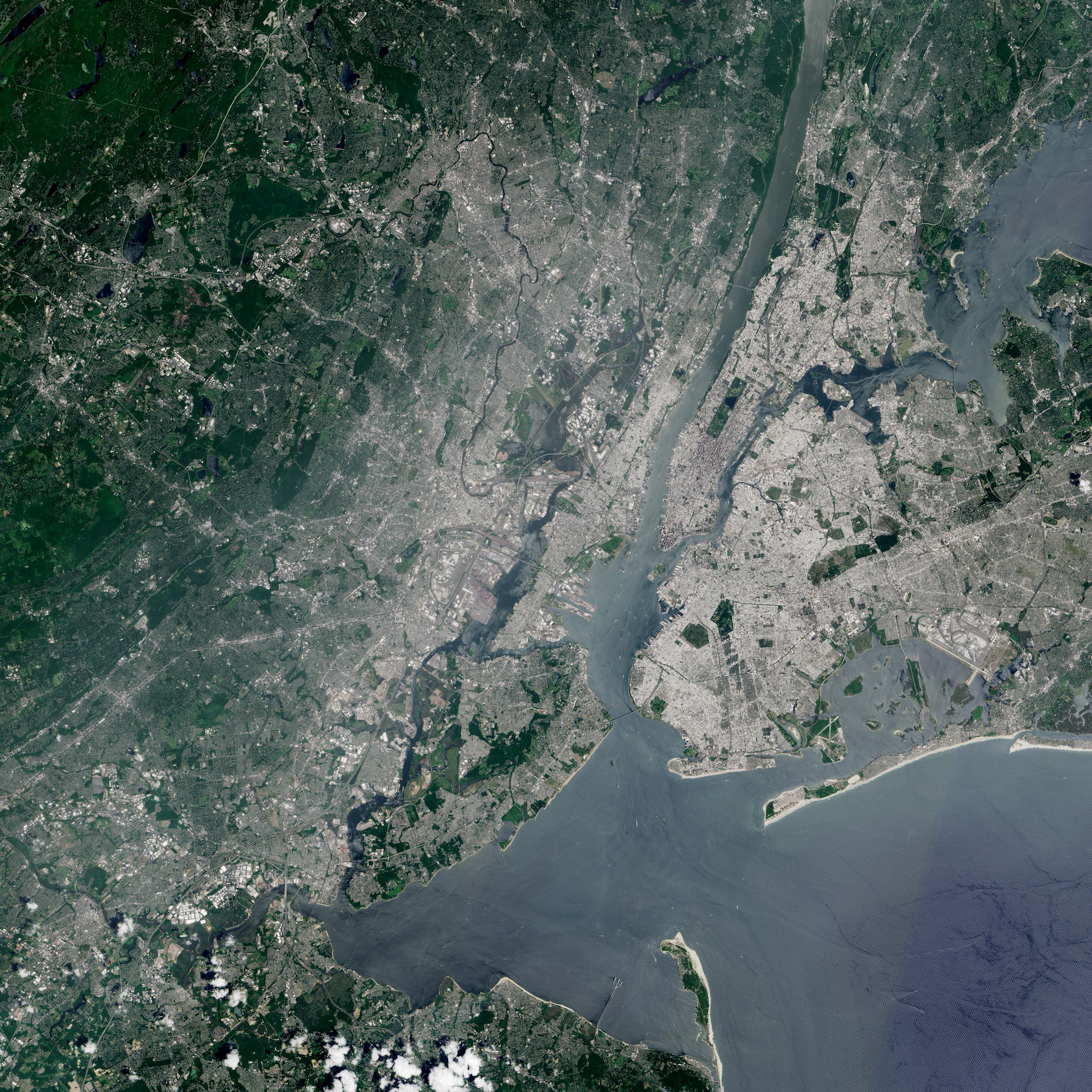 The photo was taken by the Operational Land Imager (OLI) onboard the Landsat 8 satellite. The Hudson River feeds into New York Harbor from the north, with Jersey City to the west and magnificent Manhattan to the east.