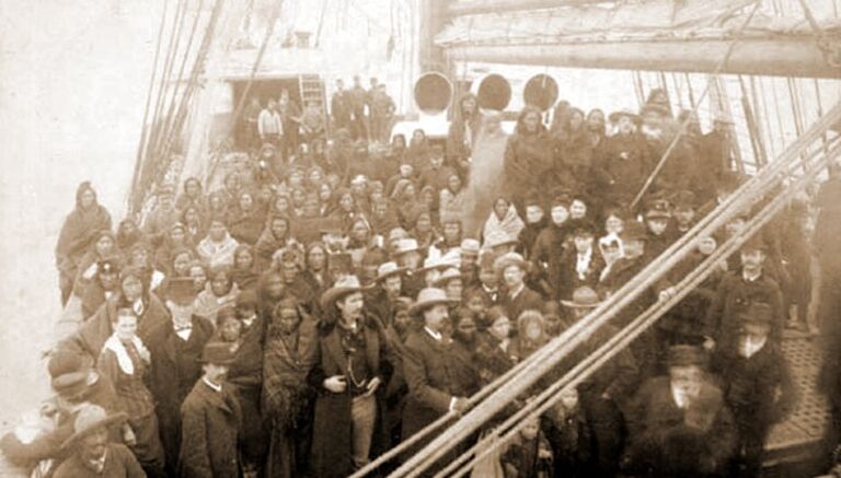 This party is made up of crew and performers from Buffalo Bill’s Wild West Show – including the chiefs Blue Horse, American Horse, and Red Shirt. And they’re standing on the deck of the SS State of Nebraska, which set sail for England in 1887. There, the Native Americans would entertain Queen Victoria and hordes of Britons during the monarch’s Golden Jubilee celebrations. Photo Credit: Merritt & Wagner