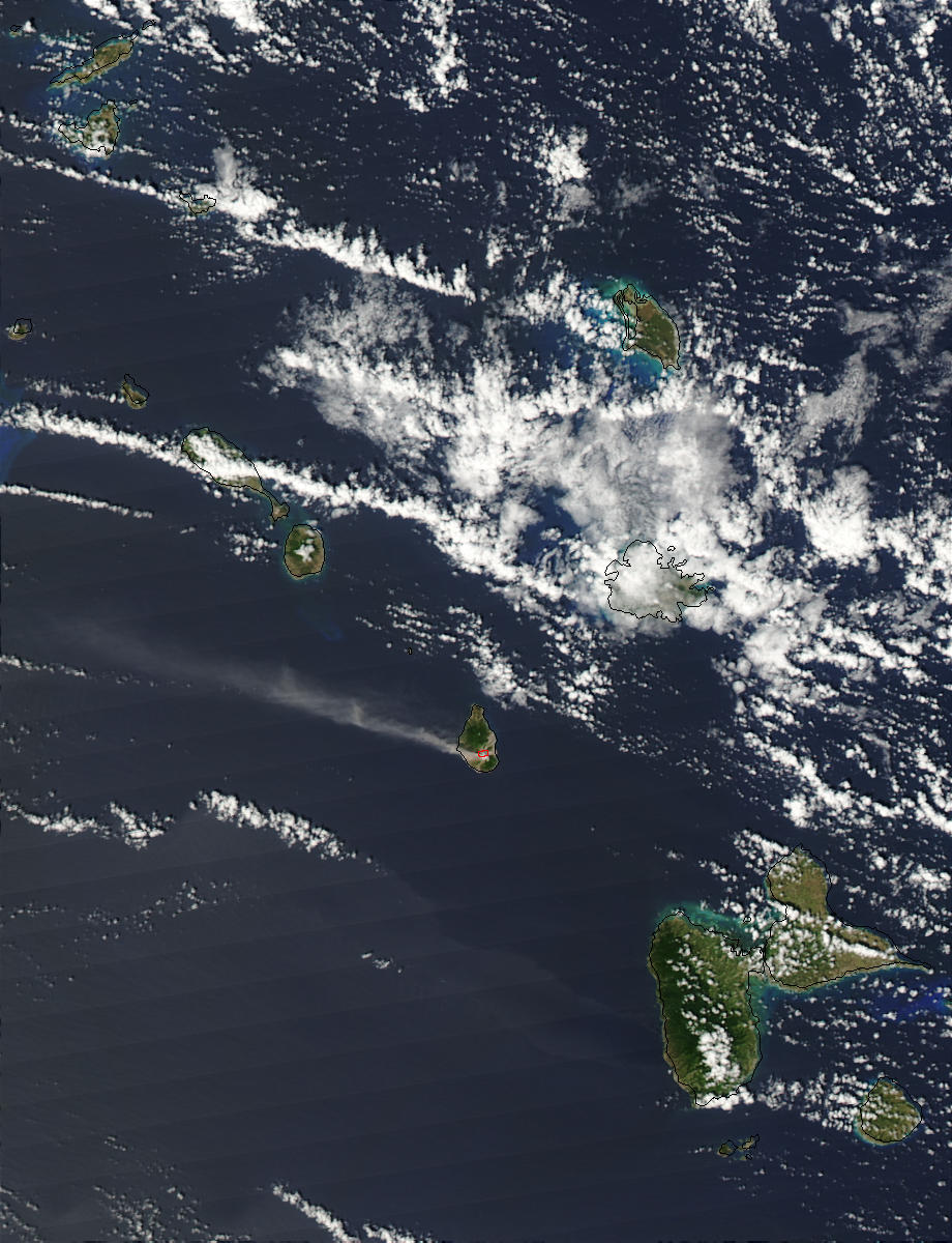 The Eruption of Soufriere Hills, Montserrat Volcano on the island of Montserrat continues to erupt. Also this true-color Moderate Resolution Imaging Spectroradiometer (MODIS) image from the Aqua satellite. Shows on February 22, 2003, shows the thermal signature marked with a red outline. A plume of emissions—probably a mixture of smoke, ash, and water vapor. Therefore is drifting eastward from the summit. Lava domes are building up on the summit, triggering pyroclastic flows.