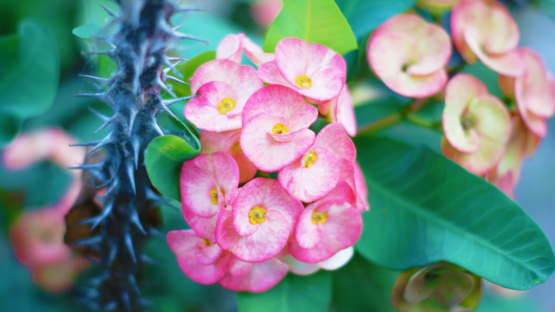 Euphorbia milii Crown of thorns is a succulent subshrub or shrub growing to 5 ft 11 in tall, with densely spiny stems. The straight, slender spines, up to 1.2 in long, help it scramble over other plants.
