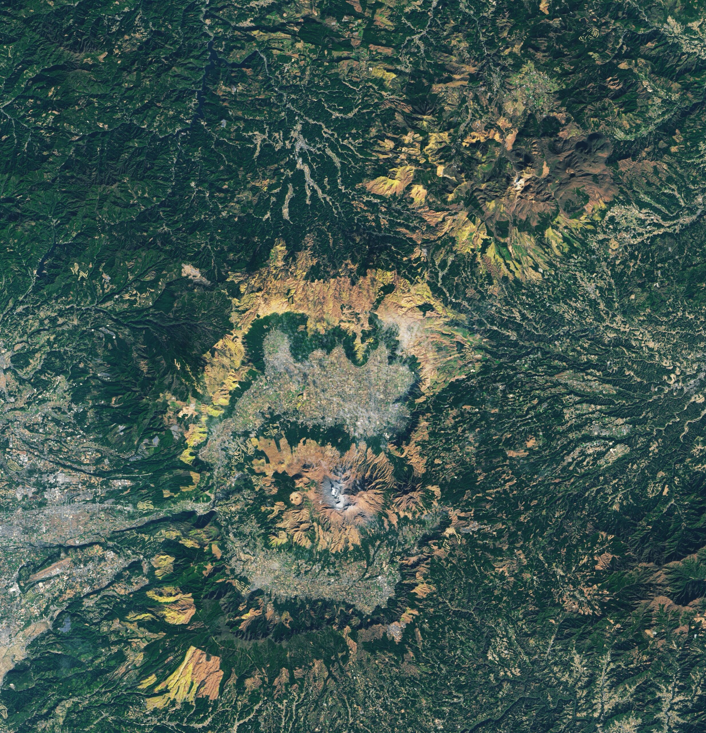 While the Northern Hemisphere had lost most of its fall color by late November, some parts of Japan were still hitting their autumn peak. In the image, colorful vegetation is still visible across the mountainous landscape of Aso-Kuju National Park.