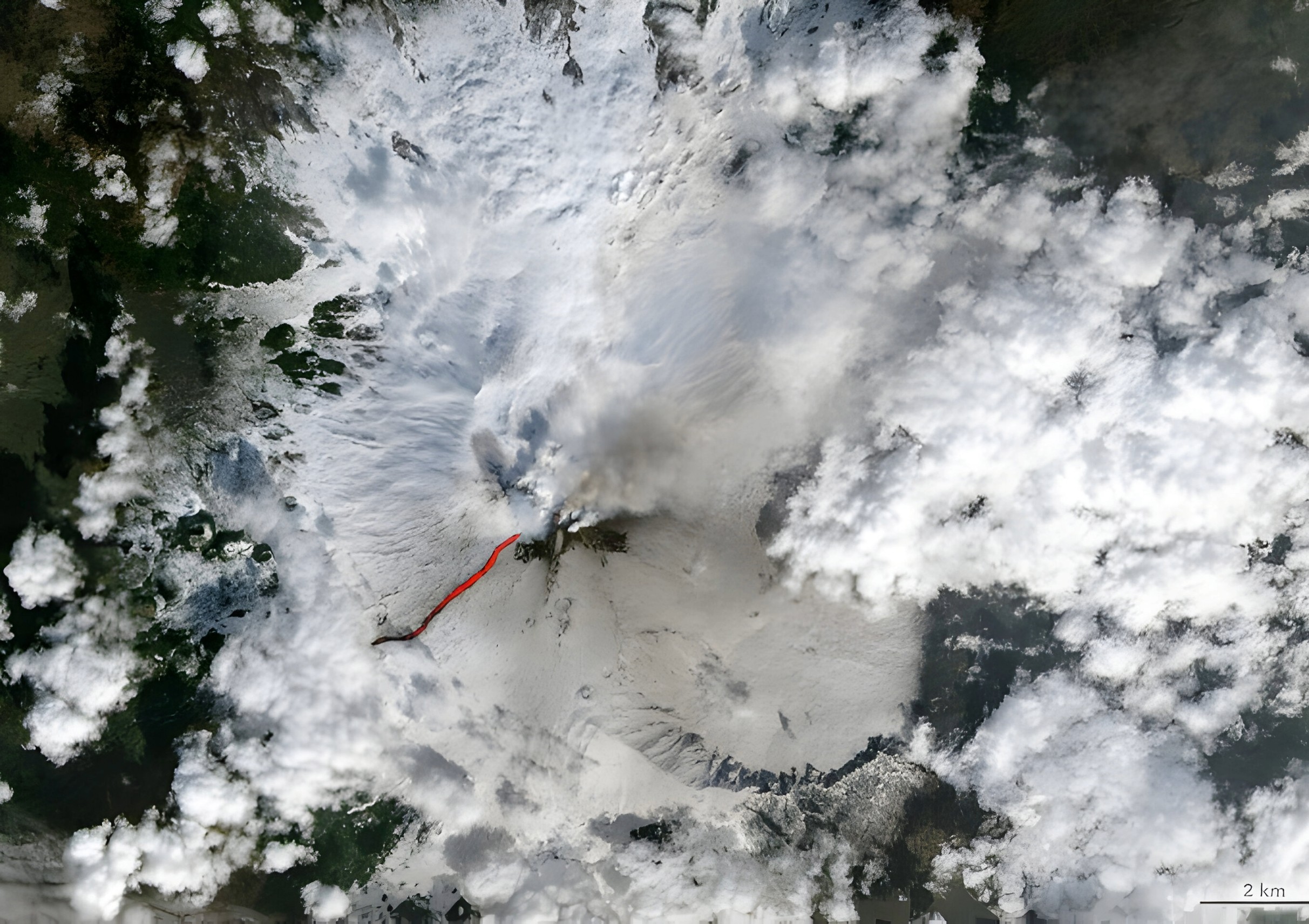 Satellite imagery has provided detailed views of the active lava flow cutting through the snow-covered slopes, with ash plumes dispersing from the summit.