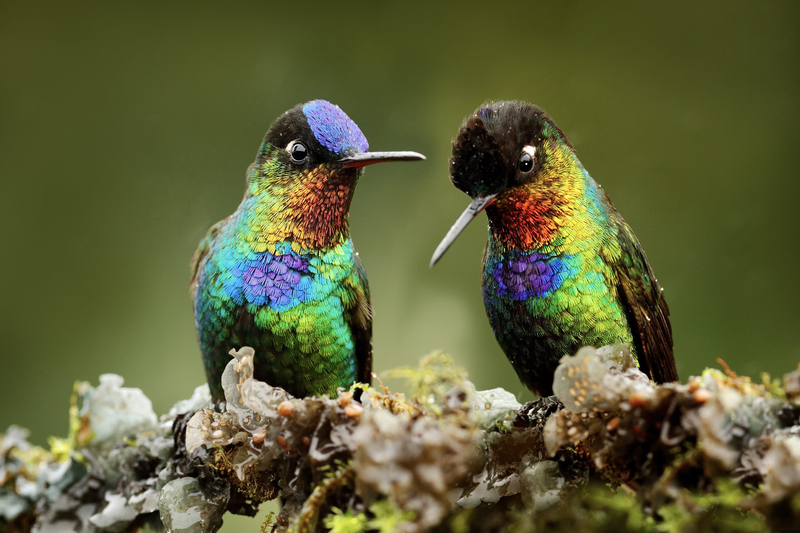 This hummingbird is native to the Talamancan montane forests of Costa Rica. The birds are a rainbow of color with a shiny green body, blue tail, brilliant blue crown, yellow-boardered bright orange throat, and violet blue chest patch.