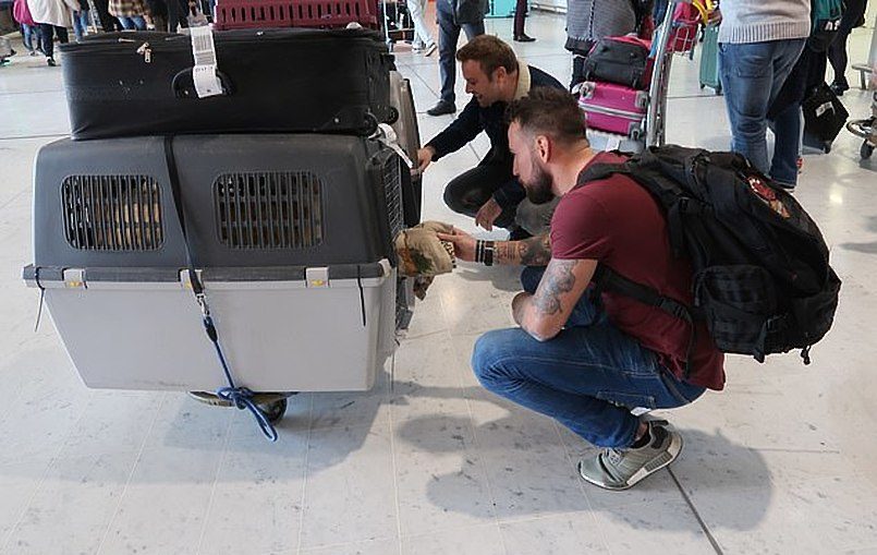 As the airline staff rolled out a dog crate, Sean recognized a familiar face peering through the door. Barrie made it to Europe after all! Holding back tears of joy, Sean reached out to hand her a gift. Photo Credit: Mercury Press and Media