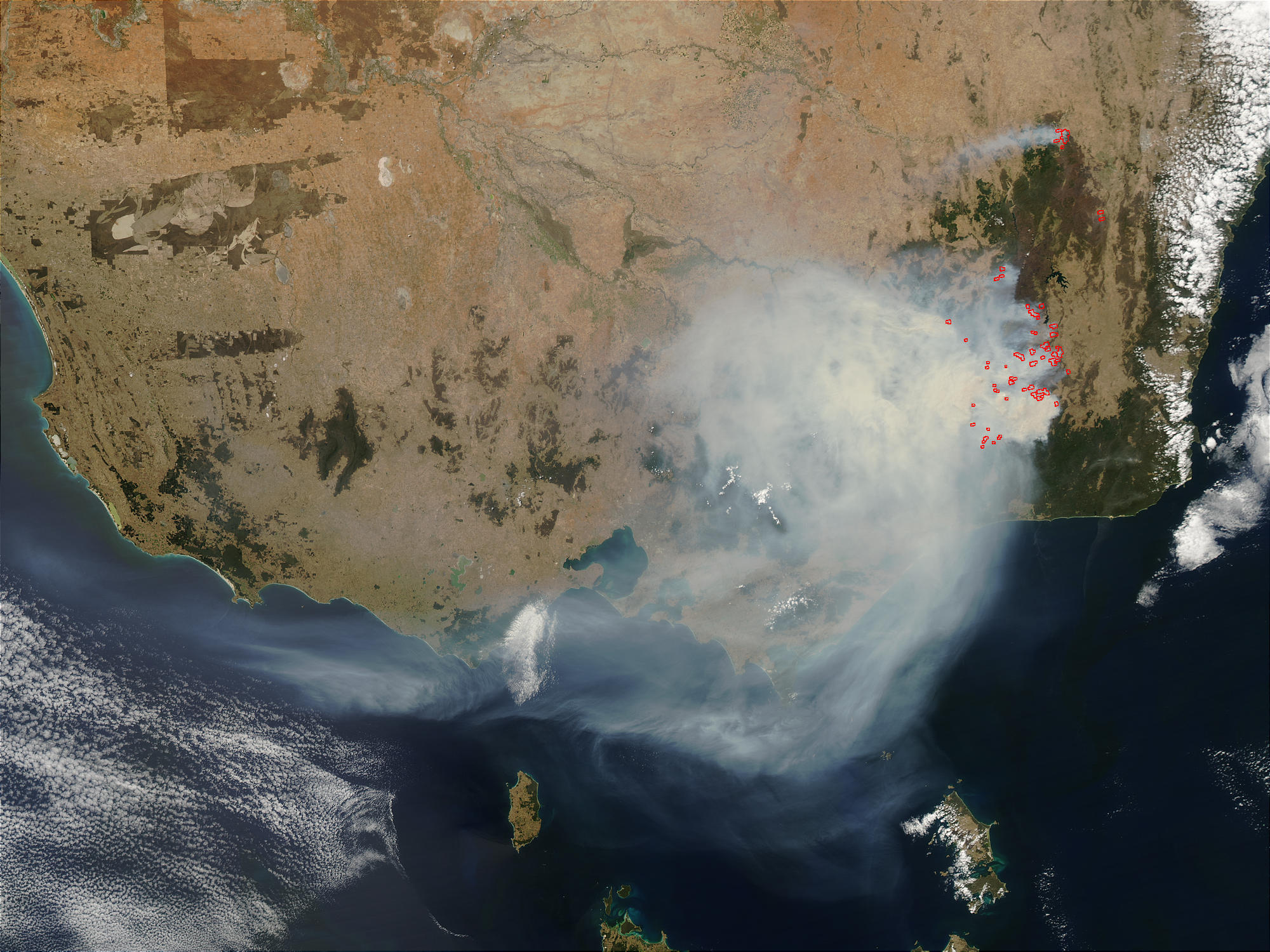 On February 2, 2003, the Moderate Resolution Imaging Spectroradiometer (MODIS) on the Aqua satellite detected fires (red dots) still burning in southeast Australia. A shroud of smoke hangs over Victoria and stretches out over the Bass Strait. These fires have been burning for about one month.