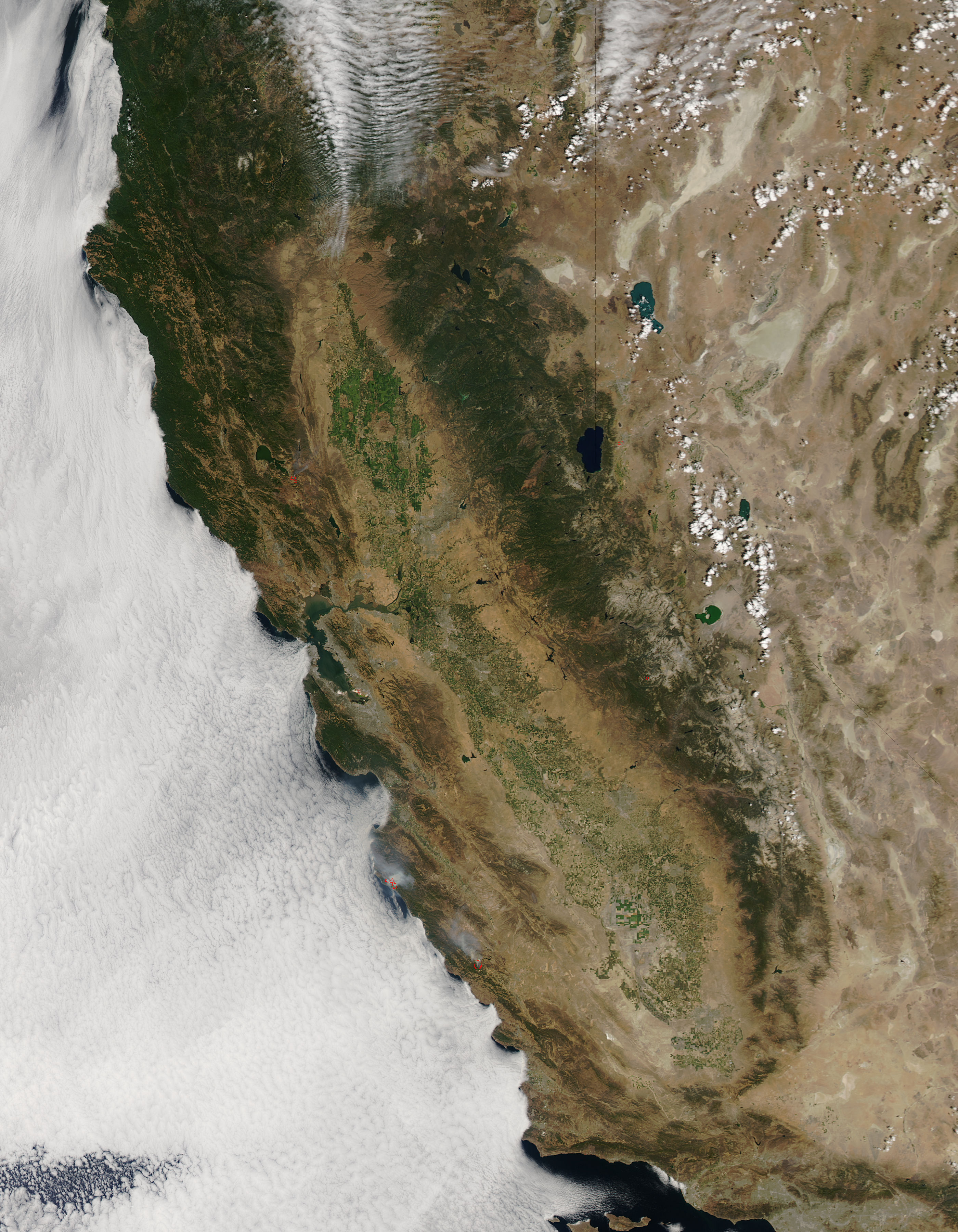 Although moisture-laden clouds hang over the Pacific Ocean, the only hints of moisture over California are the low clouds (fog) creeping over the coastline and a thin bank of clouds over the mountains in the north of the image. Three large hotspots, marked in red, can be seen in California and one in Nevada. Each red hotspot is an area where the thermal sensors on the MODIS instrument detected heat signatures that, in this case, mark actively burning fire.