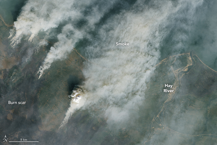 Today’s Image of the Day from NASA Earth Observatory features a large forest fire in the South Slave region of Canada. At the time this photo was captured, the fire was spreading northeast toward Hay River – a town of about 3,000 people.