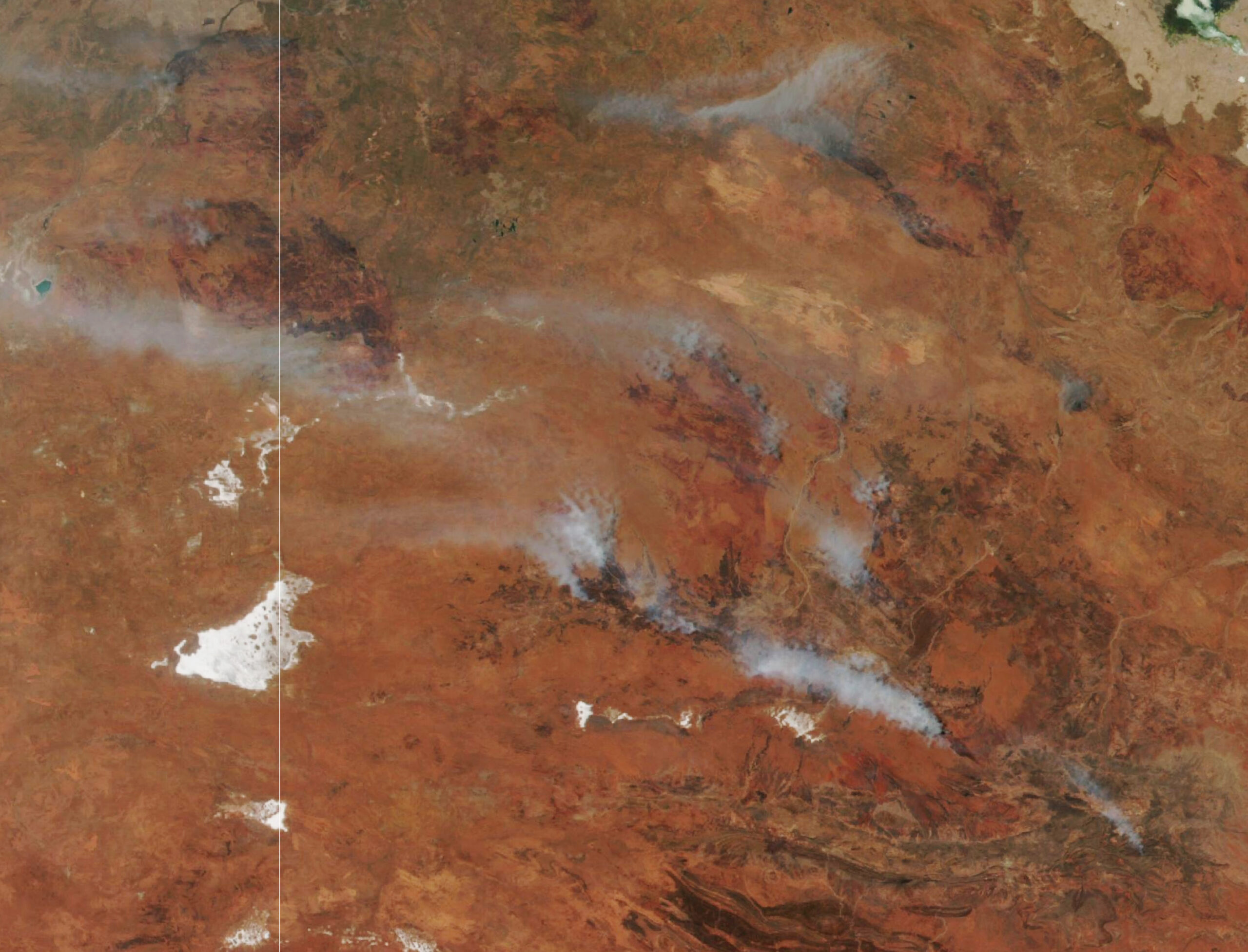 “The largest plume of smoke in the image streamed from the Gillens Bore fire, located approximately 85 kilometers north of Alice Springs, along the Stuart Highway.”