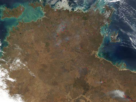 Fires Across Northern Australia. Early dry season fires (red dots) were burning across Arnhem Land in Northern Territory, Australia, at the time of this Moderate Resolution Imaging Spectroradiometer (MODIS) image from the Aqua satellite captured on June 17, 2004. Fires were also detected on Melville Island, to the northwest of the mainland across Van Diemen Gulf, which is filled with streamers of tan-colored sediment. A particularly smoky line of fires is burning east of the Joseph Bonaparte Gulf, at lower left in the image.