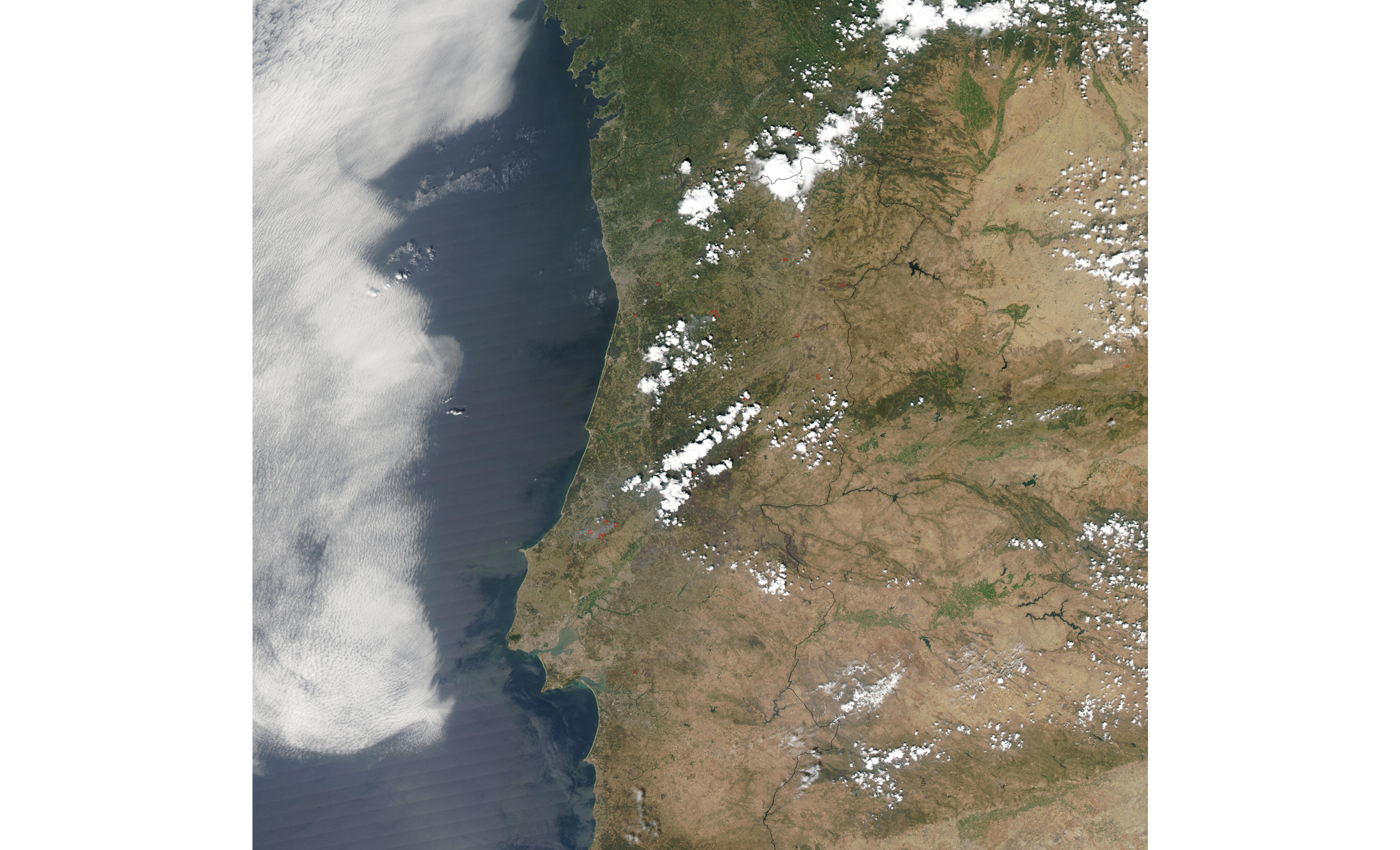 Firefighters in Portugal have brought most of the severe fires that were plaguing the country over the last week under control, but high temperatures, gusty winds, and the threat of electrical storms this coming weekend mean the danger has not yet passed, and a few of the fires still burning (marked with red dots in this image) are proving difficult to contain. This image of the fires was captured by the Moderate Resolution Imaging Spectroradiometer (MODIS) on the Aqua satellite on August 7, 2003. Fires are scattered across northern Portugal (left) and Spain (right), while a large burn scar is evident in central Portugal (see false-color image).