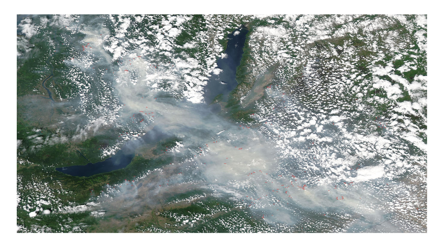Thick smoke spreads southeastward from fires burning on either side of Lake Baikal (center) in southern Russia. Active fire detections have been marked with red dots in this Moderate Resolution Imaging Spectroradiometer (MODIS) image from the Aqua satellite on July 6, 2003.