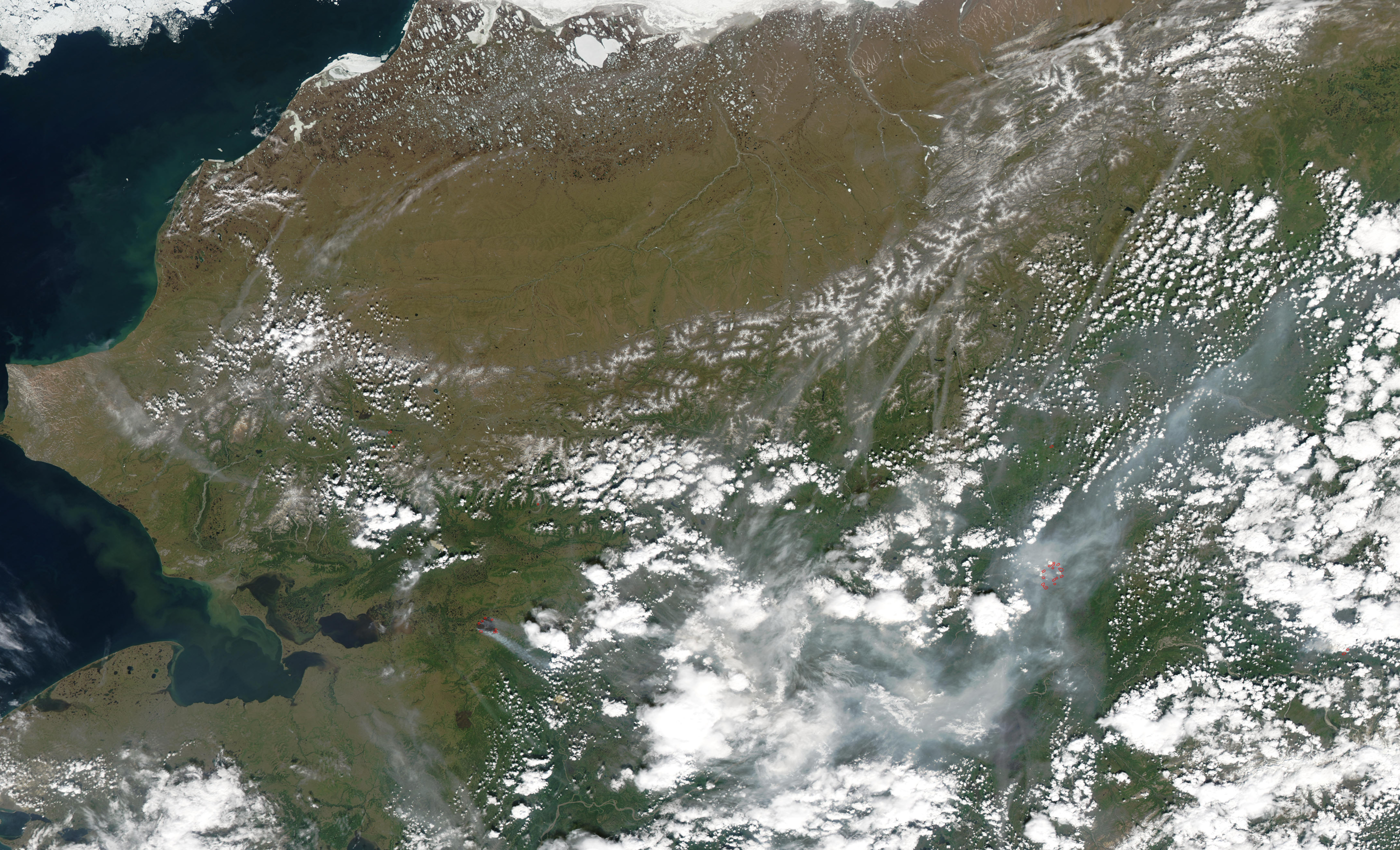 Fires and Smoke in Alaska. Thunderstorms over Alaska drove active fire behavior at the 40,000-acre Sand Creek Fire in east-central Alaska (largest cluster of red dots) on June 22 and 23, 2003. These Moderate Resolution Imaging Spectroradiometer (MODIS) images from late June show active fire locations marked with red dots. Other scattered fires were detected across the state.