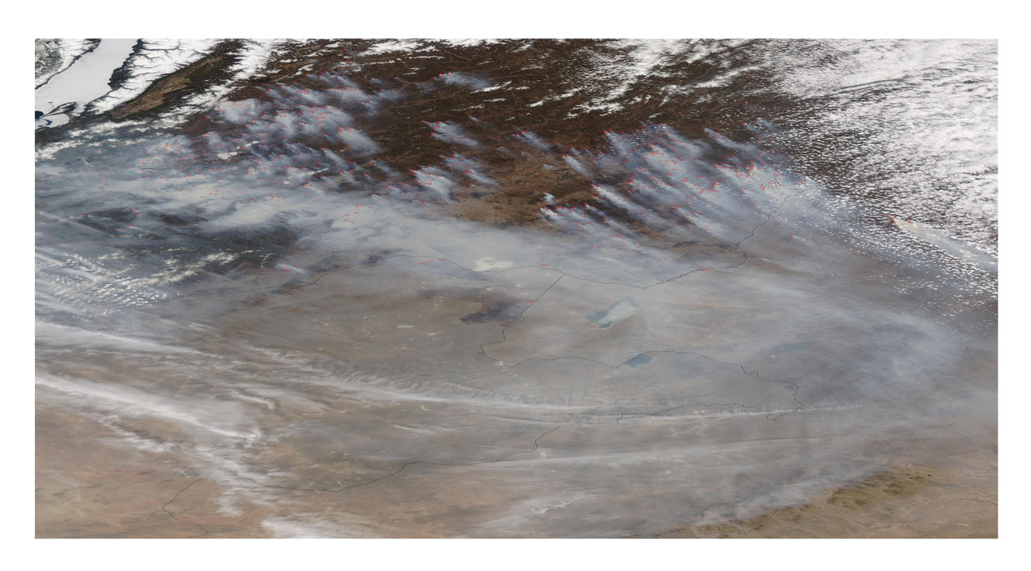 Southeast of Lake Baikal (top left corner), scores of fires are burning across southern Russia on May 7, 2003. This Moderate Resolution Imaging Spectroradiometer (MODIS) image from the Aqua satellite shows active fires marked with red dots. The fires are producing rivers of smoke which extend far to the south into China and have spread eastward over the Pacific Ocean.