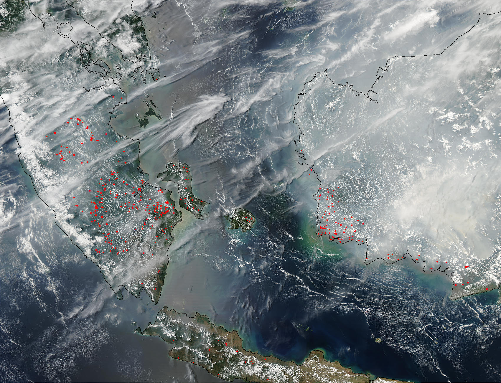 This true-color Moderate Resolution Imaging Spectroradiometer (MODIS) image from September 18, 2002. Also shows scores of fires in Indonesia veiling the region with thick smoke. Therefore at left is the island of Sumatra, at bottom is Java, and at right is Borneo. Although the northern half of which is part of Malaysia. These Fires and Smoke in Malaysia and Borneoare shown with red dots.