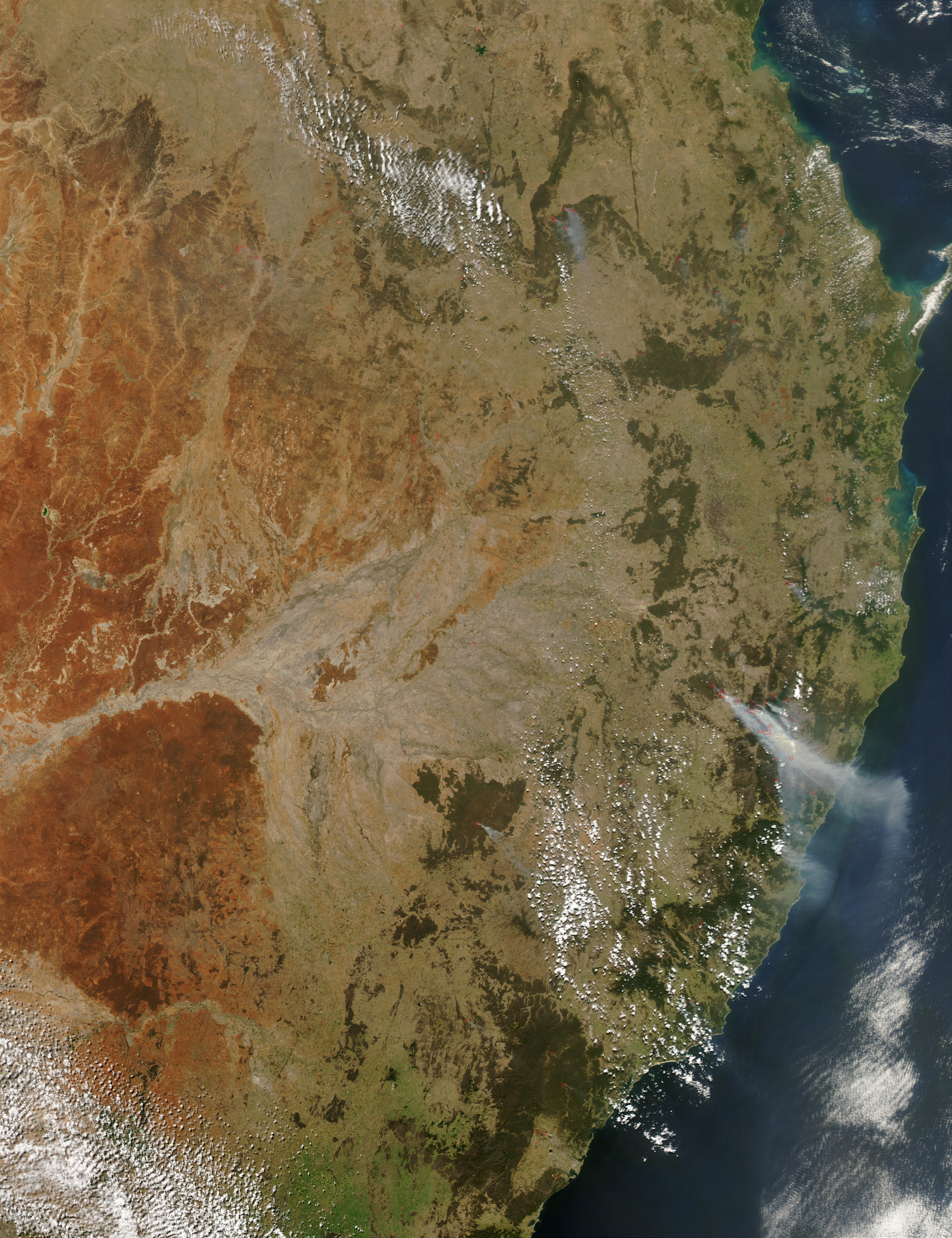Fires and Smoke in New South Wales, Australia. News reports from New South Wales, Australia, indicate that fire danger is high across the region and that as of October 7, 2002. Also 70 fires were burning across the state, 20 of which were out of control. These are true-color Moderate Resolution Imaging Spectroradiometer (MODIS) images. Therefore acquired by the Terra and Aqua MODIS instruments beginning on October 8, 2002.