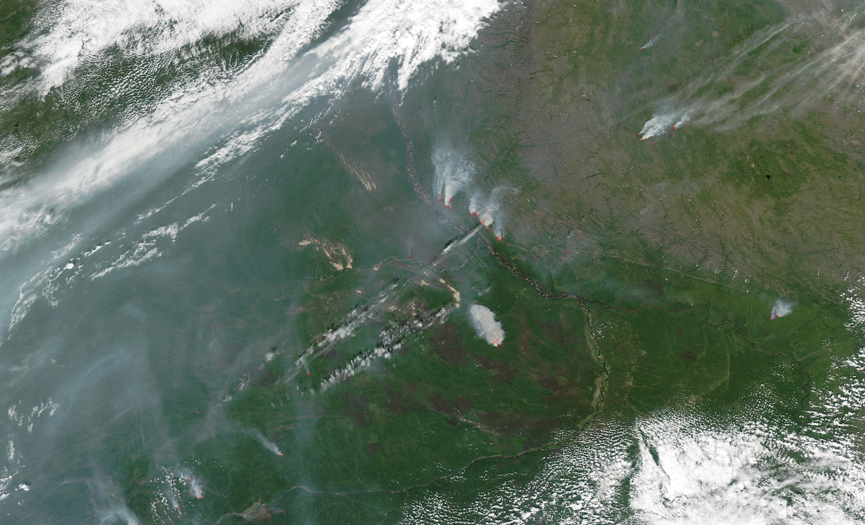 Huge, charcoal-colored burn scars stand out amid the green vegetation in central Russia near the Lena River. The Lena flows into the scene at bottom left and heads northeastward through the bottom of the image. At a sharp bend, the Lena heads north through the eastern portion of the Central Siberian Plateau. The channel of the river takes on a braided appearance in this section. In this Moderate Resolution Imaging Spectroradiometer (MODIS) image from the Aqua satellite on July 22, 2003, several large fires were detected by MODIS and are marked with red dots. The large amounts of smoke being produced by the fires could be due to burning peat—the thick layer of richly organic soil that occurs in northern ecosystems.