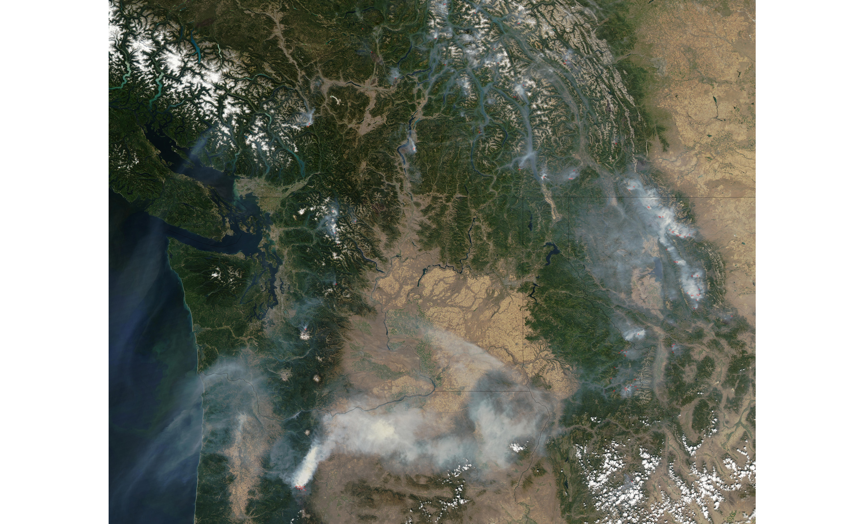 Fires rage through the Pacific Northwest in this Moderate Resolution Imaging Spectroradiometer (MODIS) image snapped by NASA´s Aqua satellite on September 2, 2003. In Oregon, the B & B complex fire in the Cascade Mountains spews smoke into the north east corner of the state. By September 4, the fire would grow to consume over 70,000 acres. To the east, over 20 large fires burn in Montana and northern Idaho. Smoke from these and other fires in British Colombia settles into the valleys of the Canadian Rocky Mountains, highlighting the craggy contours of the land.