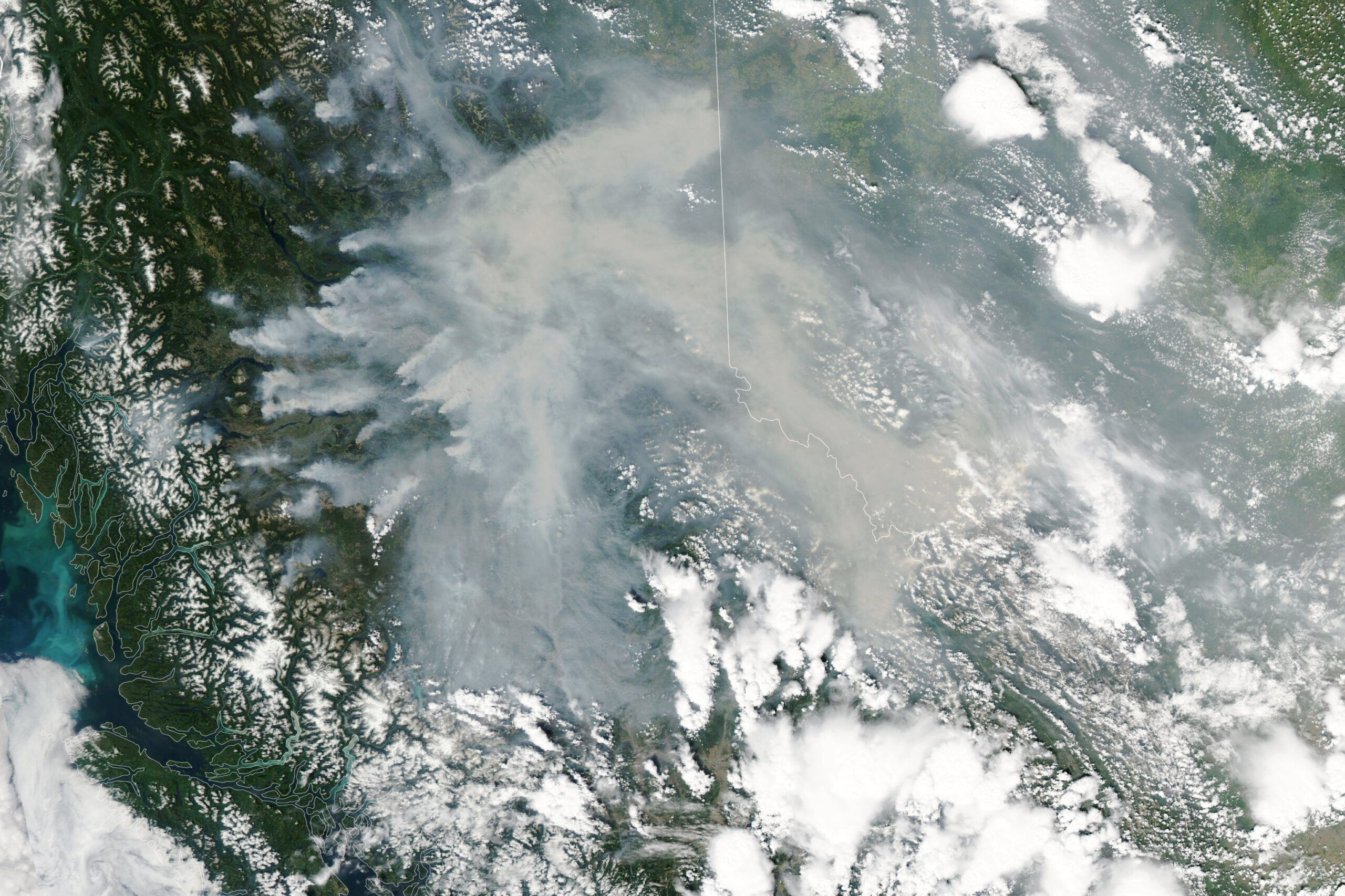 “Several blazes in British Columbia have produced smoke-infused storm clouds known as pyrocumulonimbus (pyroCb) in recent weeks, though the features are not apparent in this image,” says NASA. “Scientists track these towering, heat-generated storms closely because they loft smoke high in the atmosphere where fast-moving upper-level winds spread the smoke widely.”