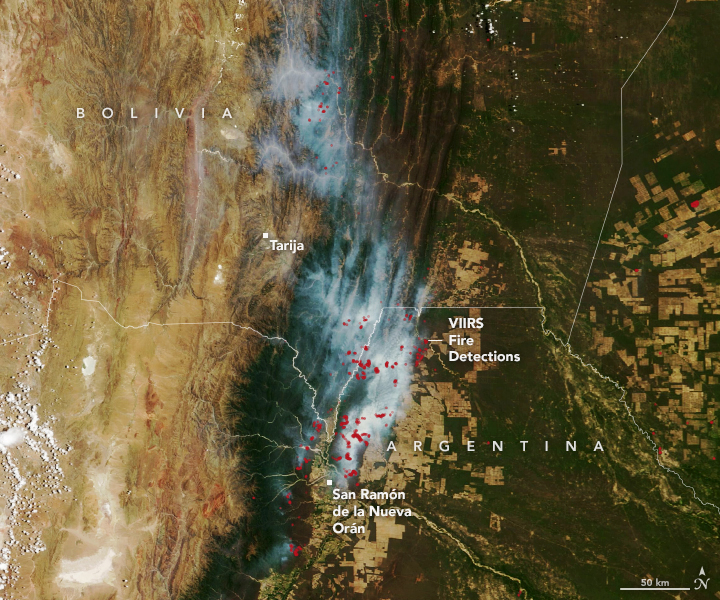 Today’s Image of the Day from NASA Earth Observatory features wildfire smoke over northwest Argentina on November 27, 2022. Most of the fires, which are represented by red dots, are burning in Salta province.