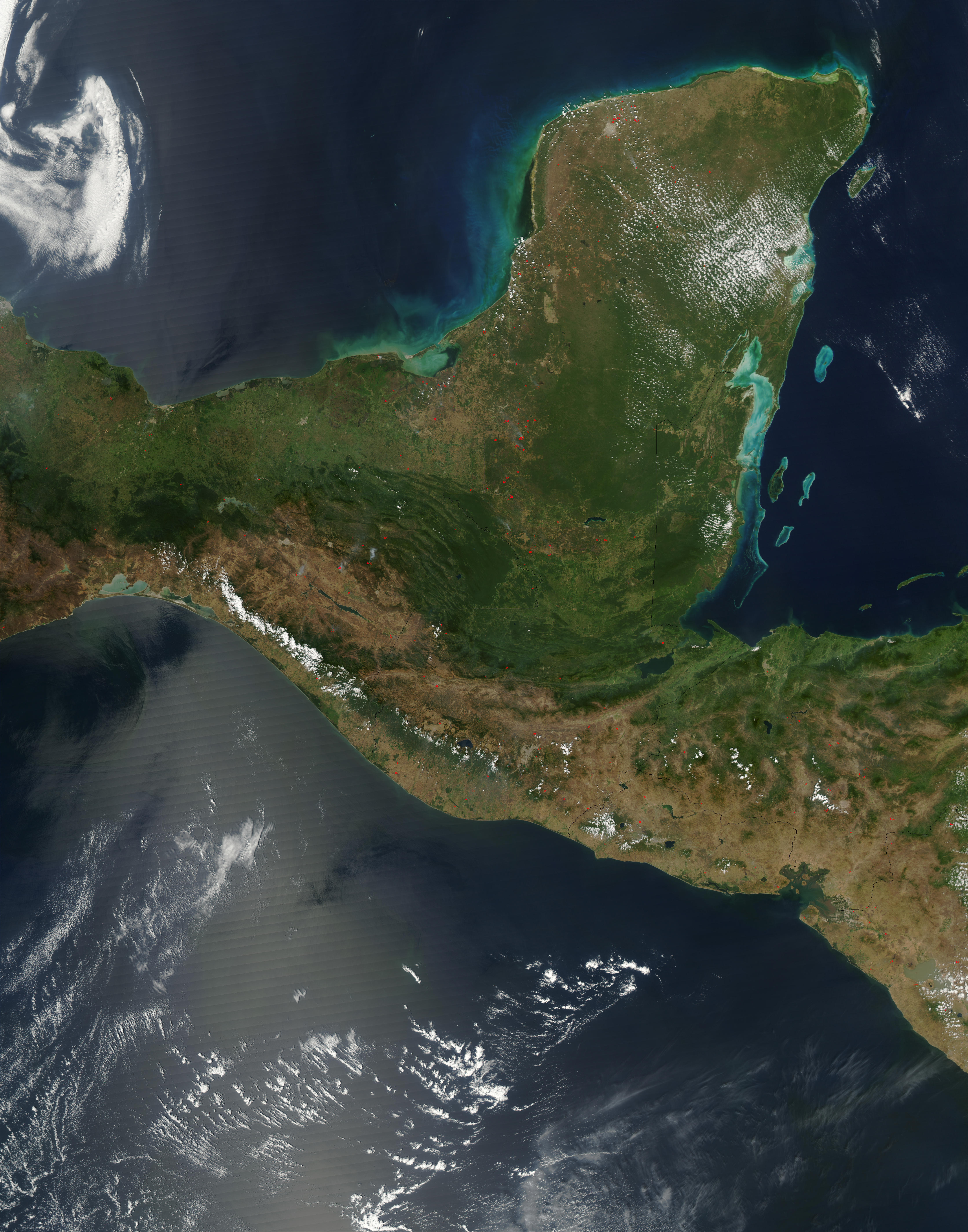 Fires (red dots) continue to burn across southern Mexico, the Yucatan Peninsula, and Central America. Countries shown are (from bottom right) Nicaragua, Honduras, El Salvador, Guatemala, Belize (to the northeast), and Mexico. At bottom left, sun glints off the Pacific Ocean. At top and right are the Gulf of Mexico and the Caribbean Sea.