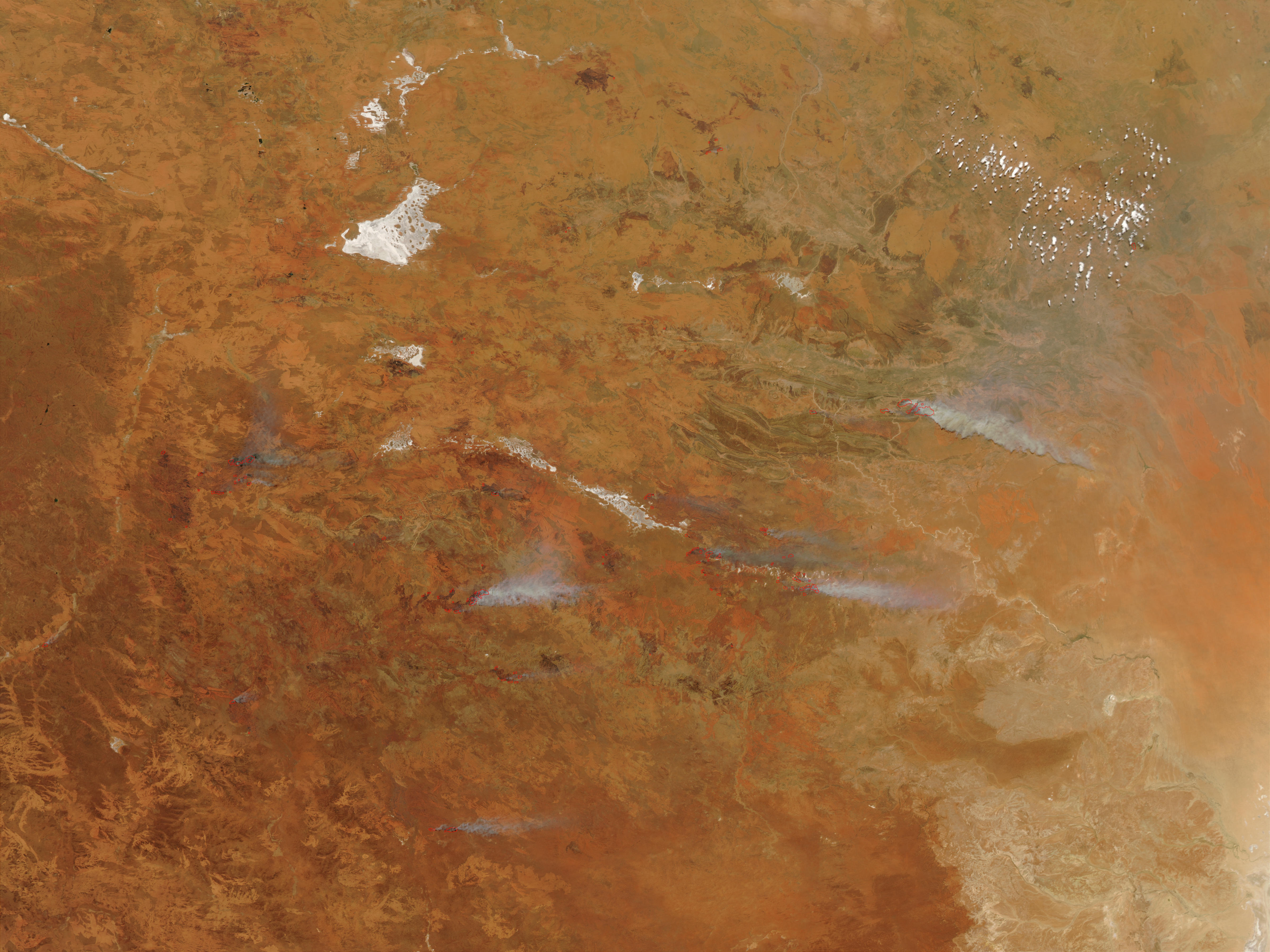 This series of images of central Australia near Alice Springs shows numerous large bushfires marked with red dots. The native vegetation of the arid region appears reddish in the true-color imagery, but the enhanced false-color image provides better contrast between vegetation and burned areas, with vegetation appearing in shades of green, naturally bare soil apearing pinkish, and burned areas appearing reddish-brown or dark brown. Some of these fires are occurring on Aboriginal lands and may be part of traditional fire management practices.