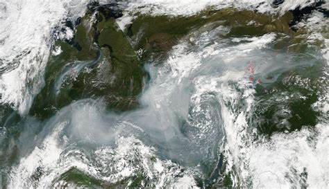 Burning in coniferous (evergreen) forests, the fires blanketed northeastern Siberia with thick brown smoke. The smoke hugs the ground near the fires, filling valleys, and soars over clouds farther away from the flames. On August 1, the smoke flowed north from the fires and over the Arctic Ocean. A wide view of the Arctic shows the smoke crossing the Bering Strait and clouding skies over northern Alaska.