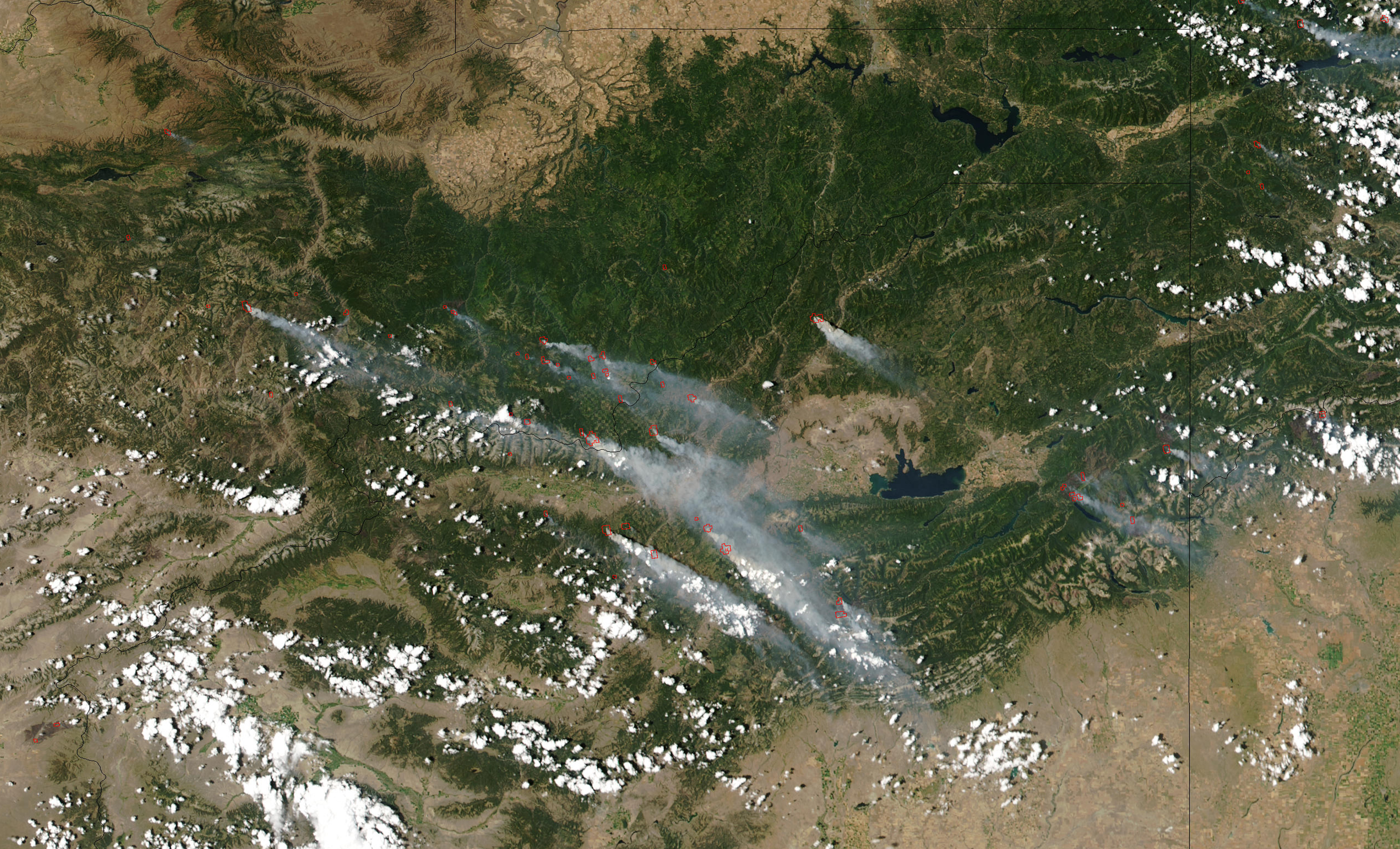 This series of Moderate Resolution Imaging Spectroradiometer (MODIS) images from the Aqua and Terra satellites shows dozens of large fires burning in the Northern Rockies in mid to late August 2003. Most of the images are centered on Montana and show Canada to the north and Idaho to the west. The fires, marked with red dots in the images, have forced hundreds of people from their homes, and put thousands on evacuation alert.