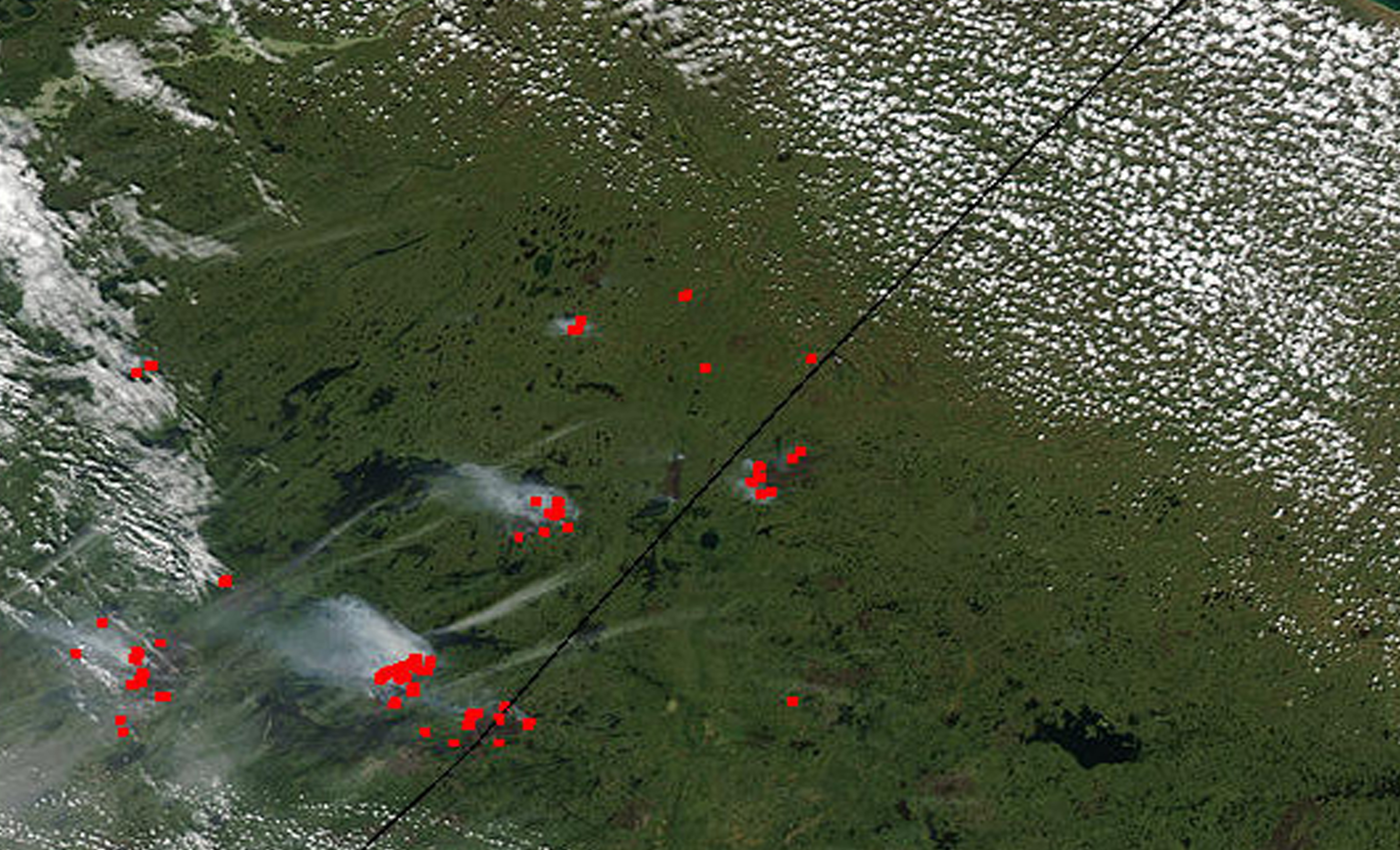 To the southwest of Hudson Bay (upper right), multiple large fires were burning across Manitoba (left) and Ontario (right) on July 2, 2003. The Northeast region of Manitoba has experienced 265 wildfires already this year, which have burned more than 130,000 hectares (more than 320,000 acres). In Ontario, there were 25 active fires of various sizes burning over an area of 262,715 hectares (almost 650,000 acres) as of June 30. These images and fire detection were made by the Moderate Resolution Imaging Spectroradiometer (MODIS) on the Aqua satellite.
