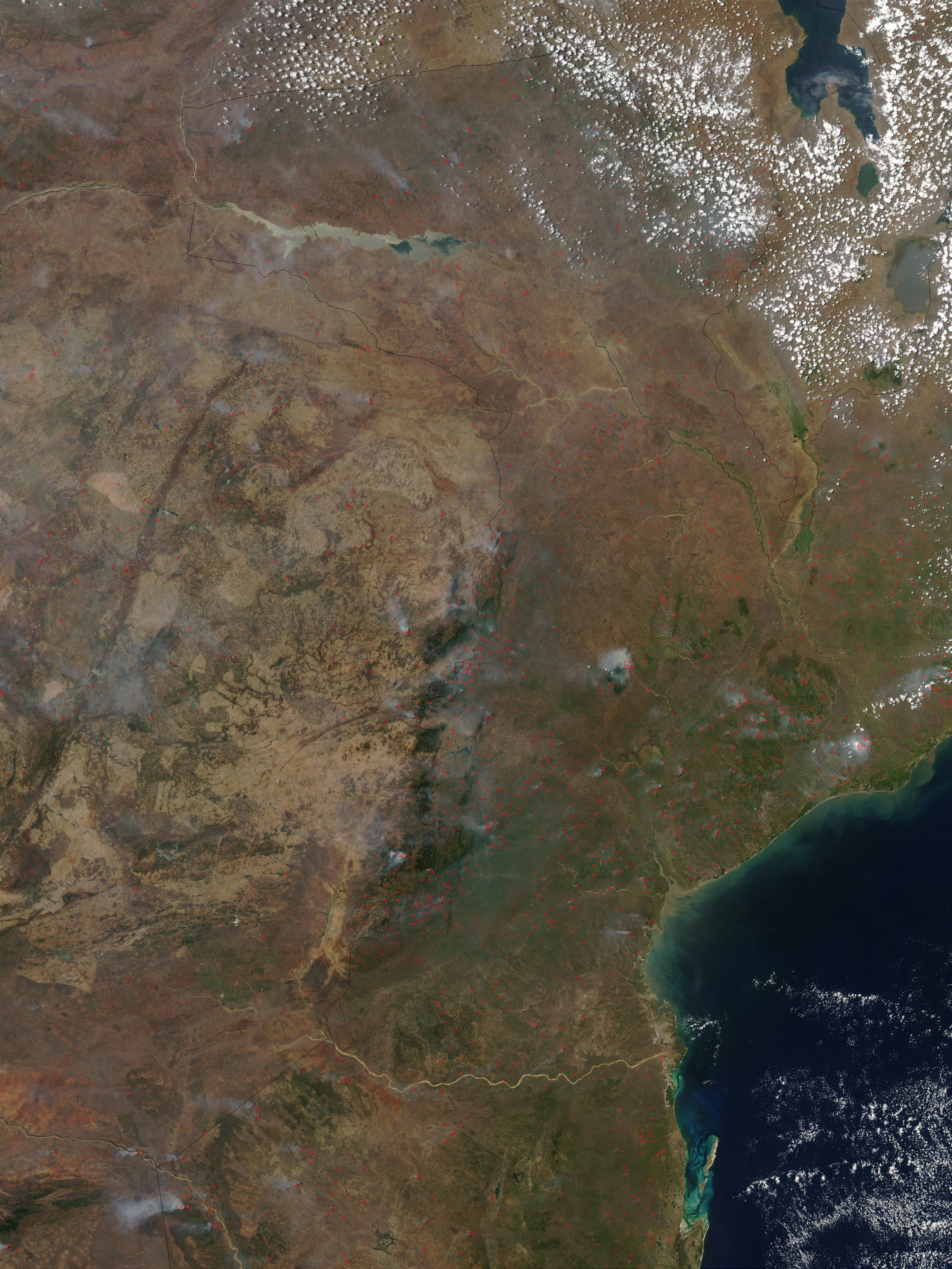 Fires in Mozambique and Zimbabwe. This series of true-color Moderate Resolution Imaging Spectroradiometer (MODIS) images was captured by the Aqua satellite. The images are generally centered on the African country of Mozambique, and highlight the widespread extent of the burning season in the region. (Fires are marked with red dots).