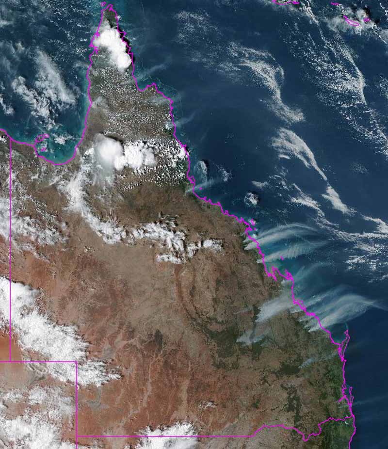 Fires in Queensland, Australia. A wide break in the smattering of small popcorn clouds to the north and south gave the Moderate Resolution Imaging Spectroradiometer (MODIS) on NASA’s Aqua satellite a clear view of numerous fires (red dots) burning in southern Queensland between the Simpson and Sturt Stony Deserts (left center edge and lower left corner, respectively) and the continent’s east coast. This image was captured on October 6, 2004.